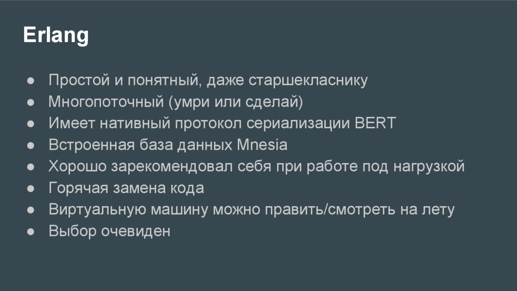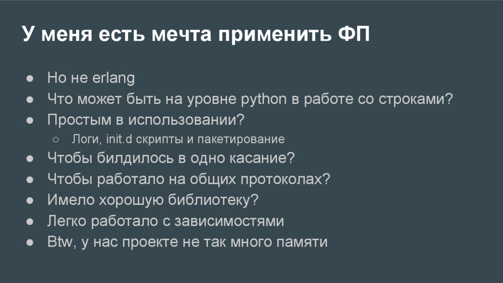• Что может быть на уровне python в работе со строками? • Простым в использовании? ◦ Логи, init.d скрипты и пакетирование • Чтобы билдилось в одно касание? • Чтобы работало на общих протоколах? • Имело хорошую библиотеку? • Легко работало с зависимостями • Btw, у нас проекте не так много памяти