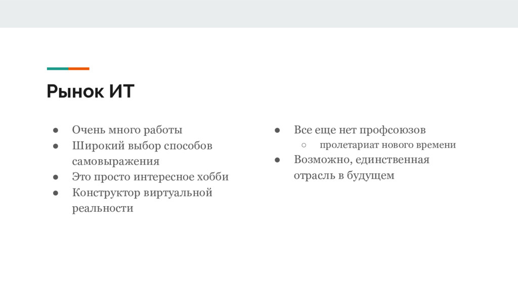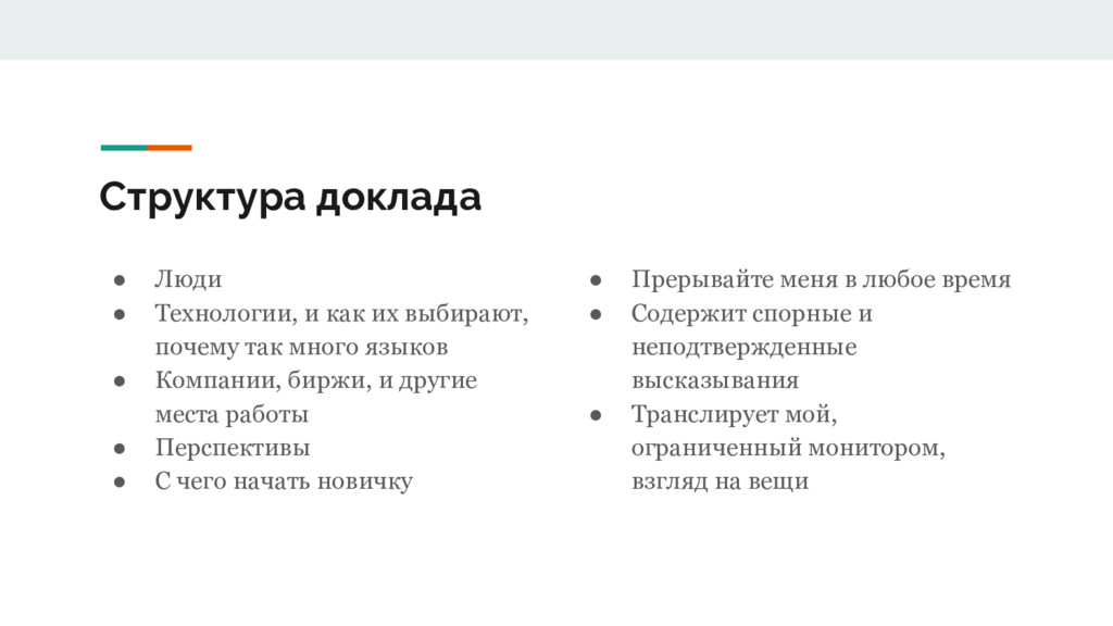 почему так много языков • Компании, биржи, и другие места работы • Перспективы • С чего начать новичку • Прерывайте меня в любое время • Содержит спорные и неподтвержденные высказывания • Транслирует мой, ограниченный монитором, взгляд на вещи