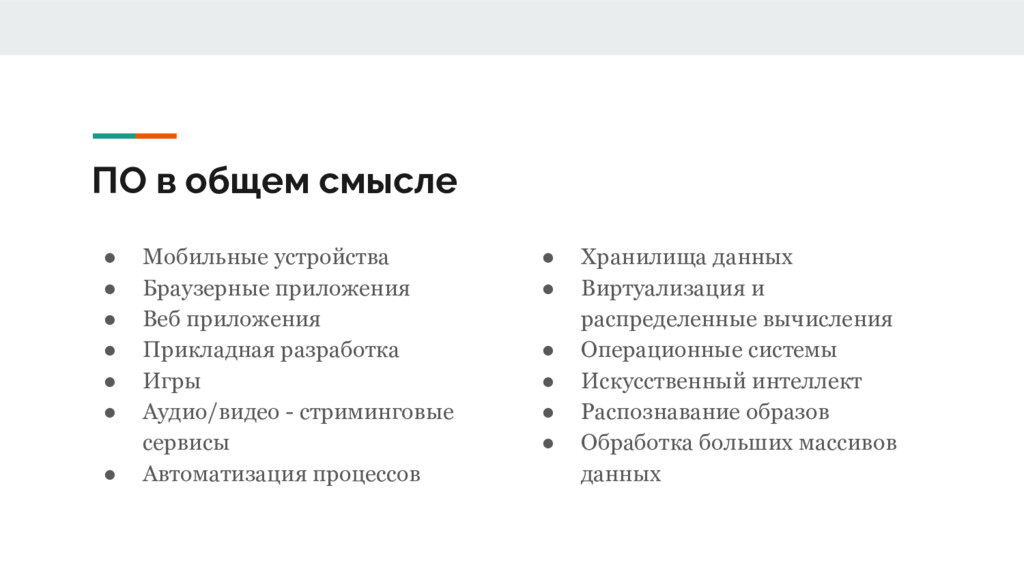 • Веб приложения • Прикладная разработка • Игры • Аудио/видео - стриминговые сервисы • Автоматизация процессов • Хранилища данных • Виртуализация и распределенные вычисления • Операционные системы • Искусственный интеллект • Распознавание образов • Обработка больших массивов данных