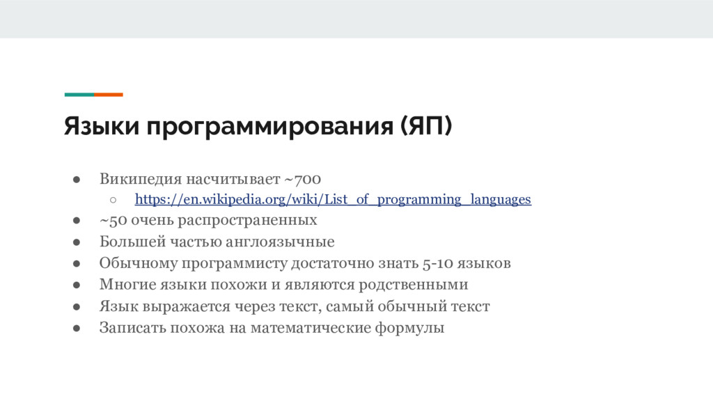 • Большей частью англоязычные • Обычному программисту достаточно знать 5-10 языков • Многие языки похожи и являются родственными • Язык выражается через текст, самый обычный текст • Записать похожа на математические формулы Языки программирования (ЯП)