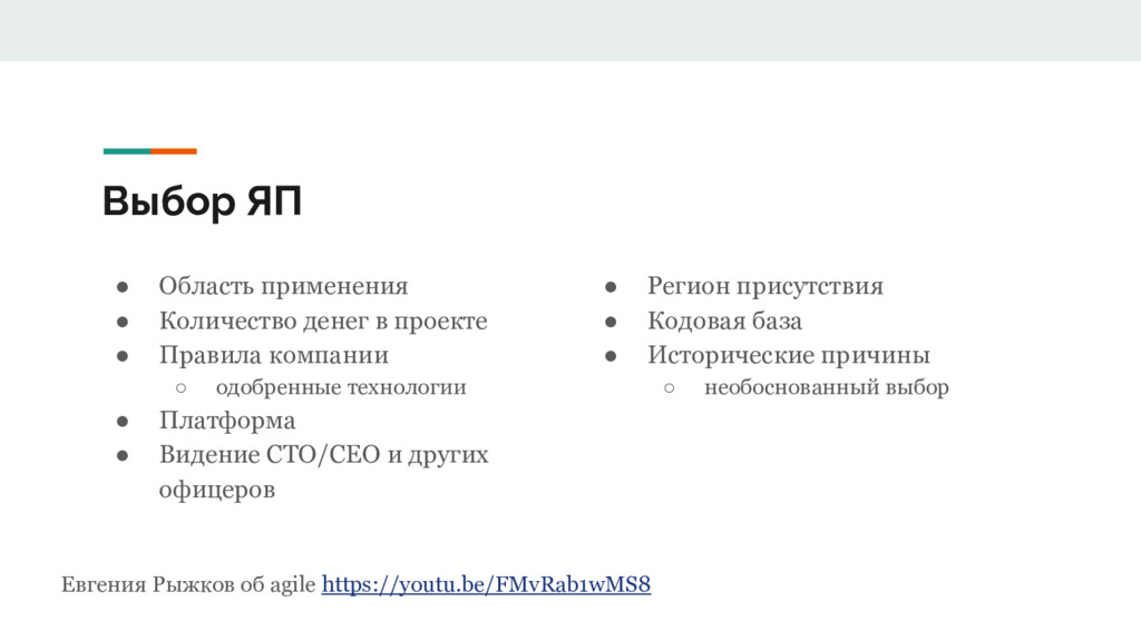• Правила компании ◦ одобренные технологии • Платформа • Видение СТО/СЕО и других офицеров • Регион присутствия • Кодовая база • Исторические причины ◦ необоснованный выбор Евгения Рыжков об agile https://youtu.be/FMvRab1wMS8
