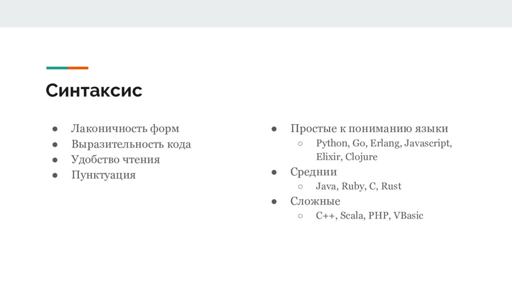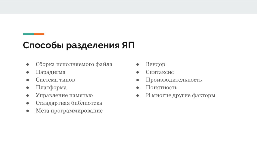 Система типов • Платформа • Управление памятью • Стандартная библиотека • Мета программирование • Вендор • Синтаксис • Производительность • Понятность • И многие другие факторы