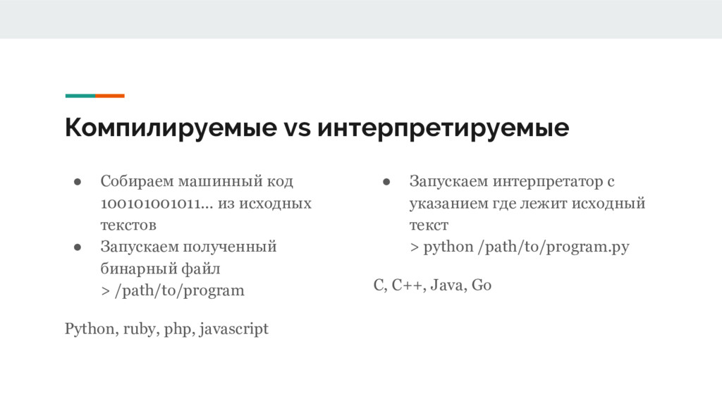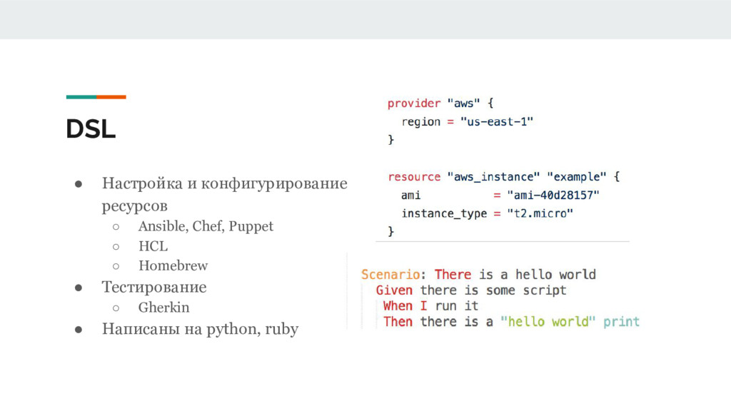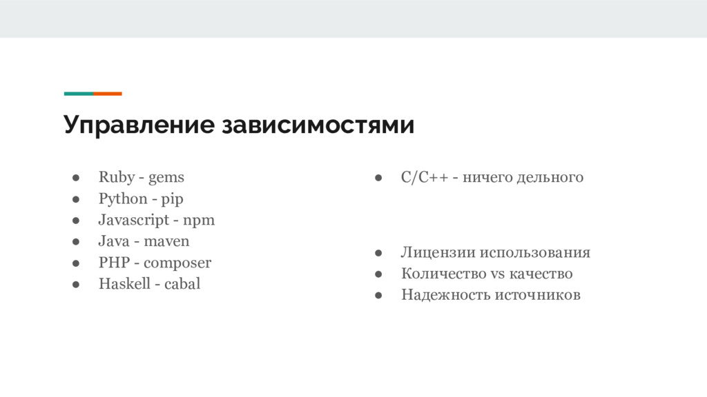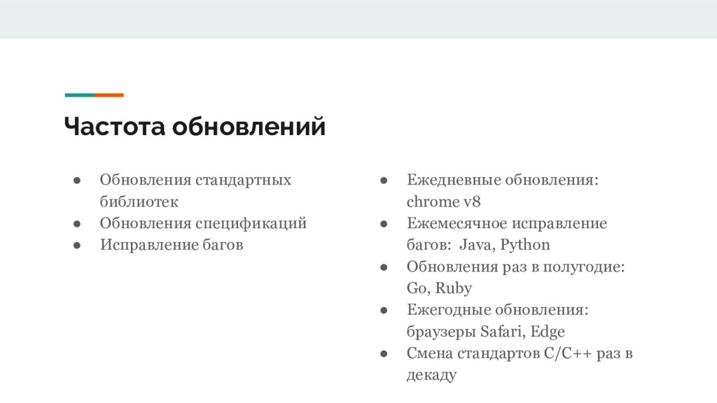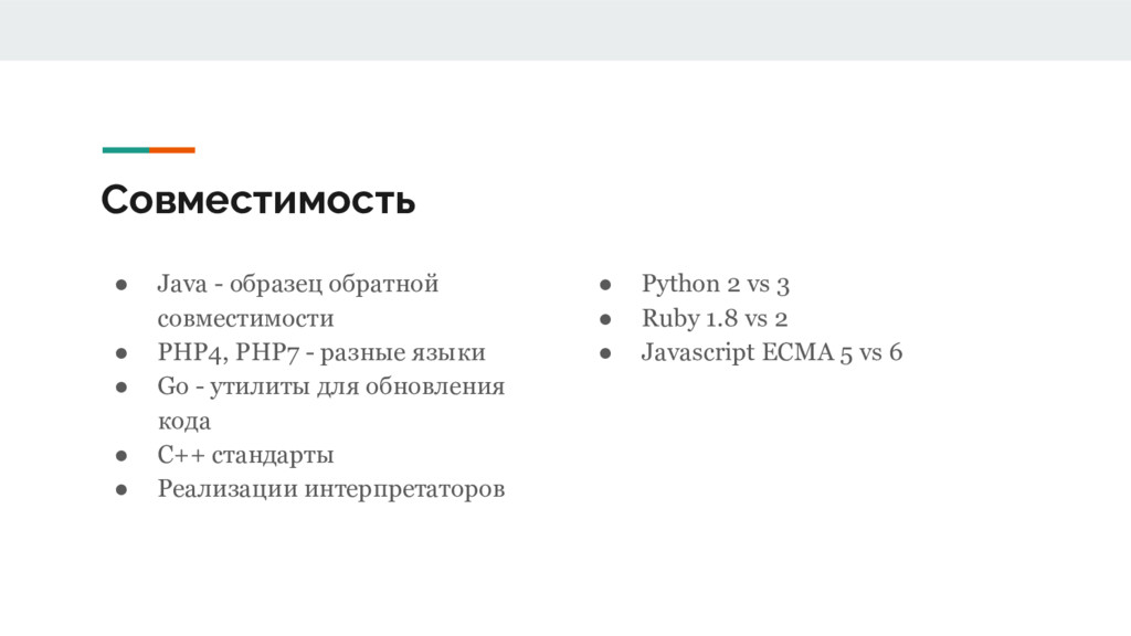 - разные языки • Go - утилиты для обновления кода • С++ стандарты • Реализации интерпретаторов • Python 2 vs 3 • Ruby 1.8 vs 2 • Javascript ECMA 5 vs 6