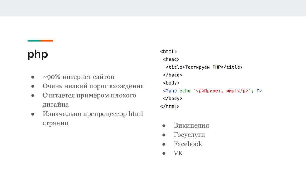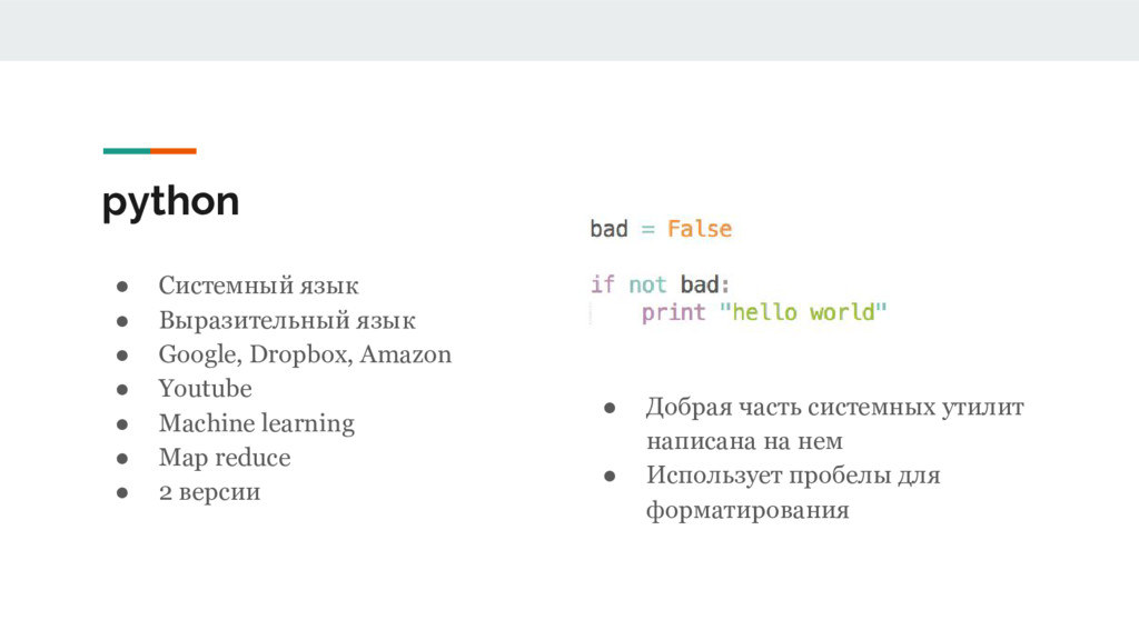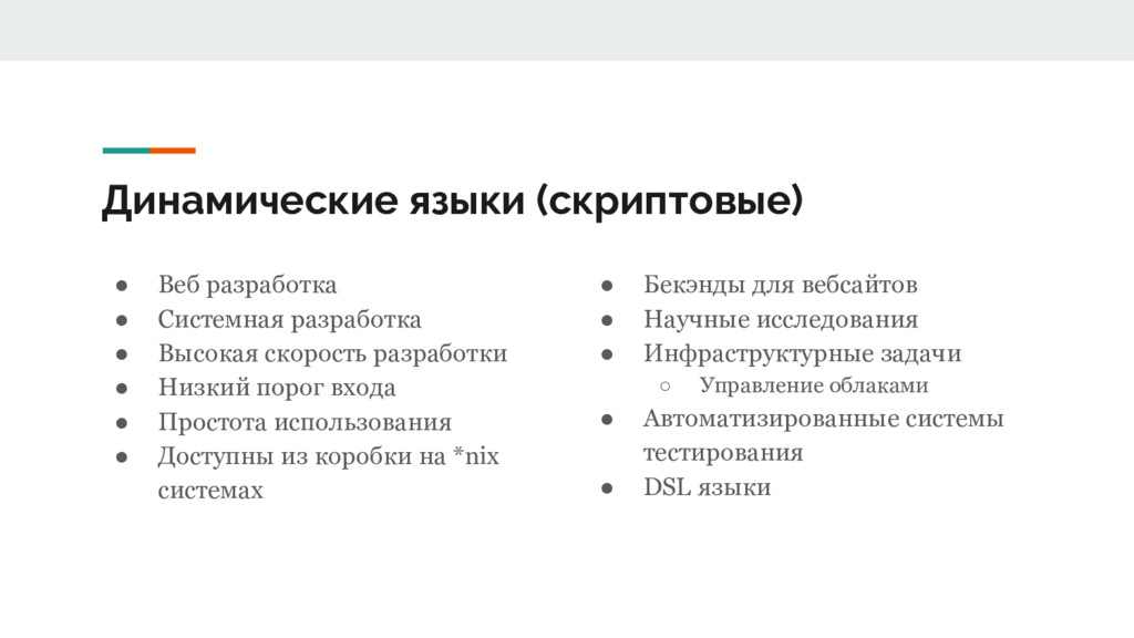 Высокая скорость разработки • Низкий порог входа • Простота использования • Доступны из коробки на *nix системах • Бекэнды для вебсайтов • Научные исследования • Инфраструктурные задачи ◦ Управление облаками • Автоматизированные системы тестирования • DSL языки