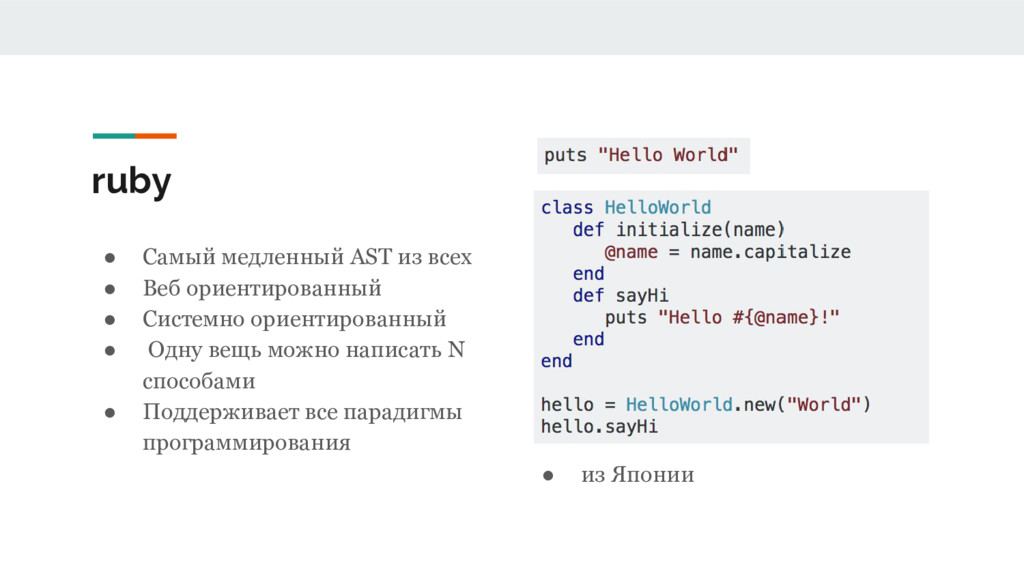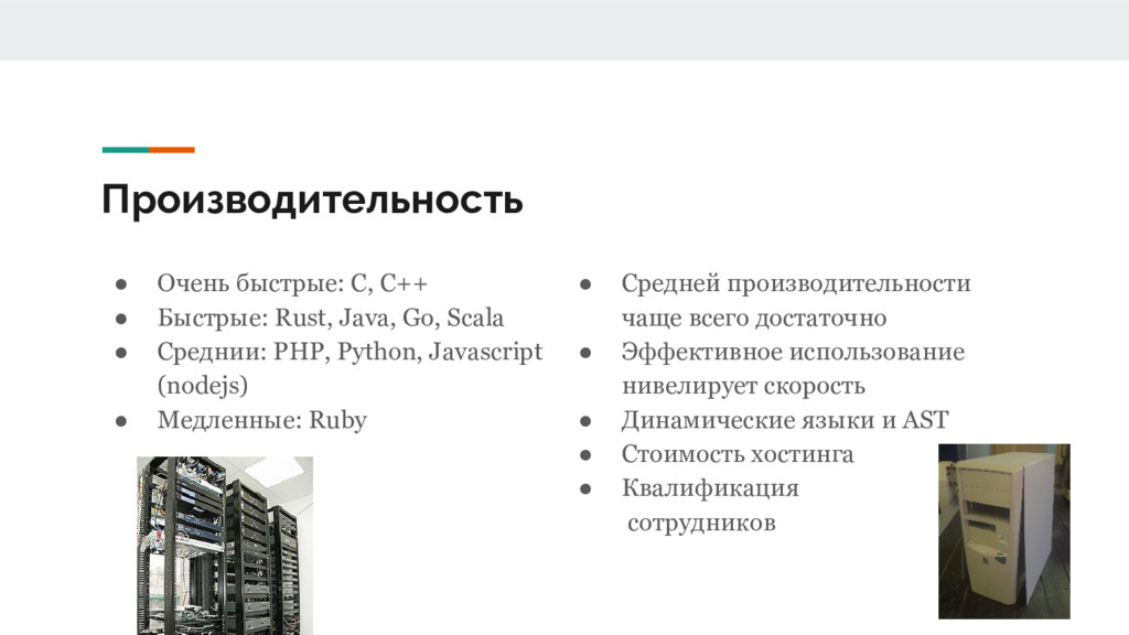 Go, Scala • Среднии: PHP, Python, Javascript (nodejs) • Медленные: Ruby • Средней производительности чаще всего достаточно • Эффективное использование нивелирует скорость • Динамические языки и AST • Стоимость хостинга • Квалификация сотрудников