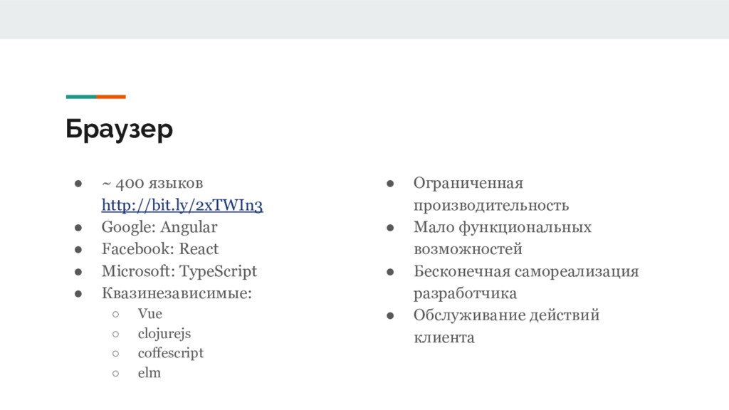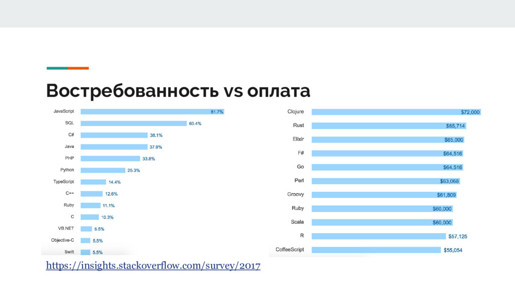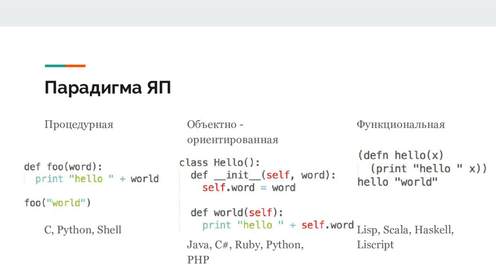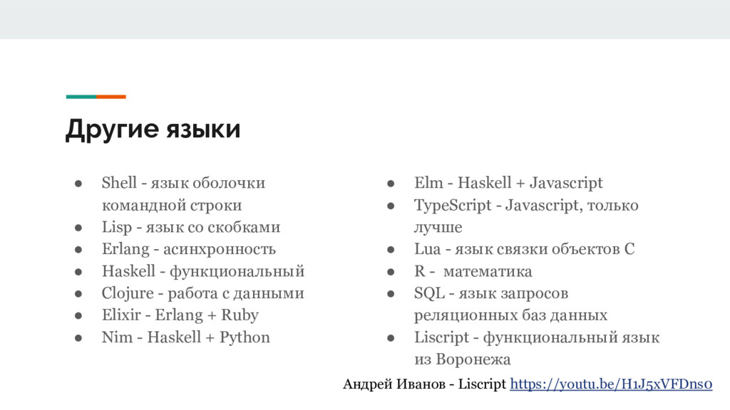 Lisp - язык со скобками • Erlang - асинхронность • Haskell - функциональный • Clojure - работа с данными • Elixir - Erlang + Ruby • Nim - Haskell + Python • Elm - Haskell + Javascript • TypeScript - Javascript, только лучше • Lua - язык связки объектов C • R - математика • SQL - язык запросов реляционных баз данных • Liscript - функциональный язык из Воронежа Андрей Иванов - Liscript https://youtu.be/H1J5xVFDns0