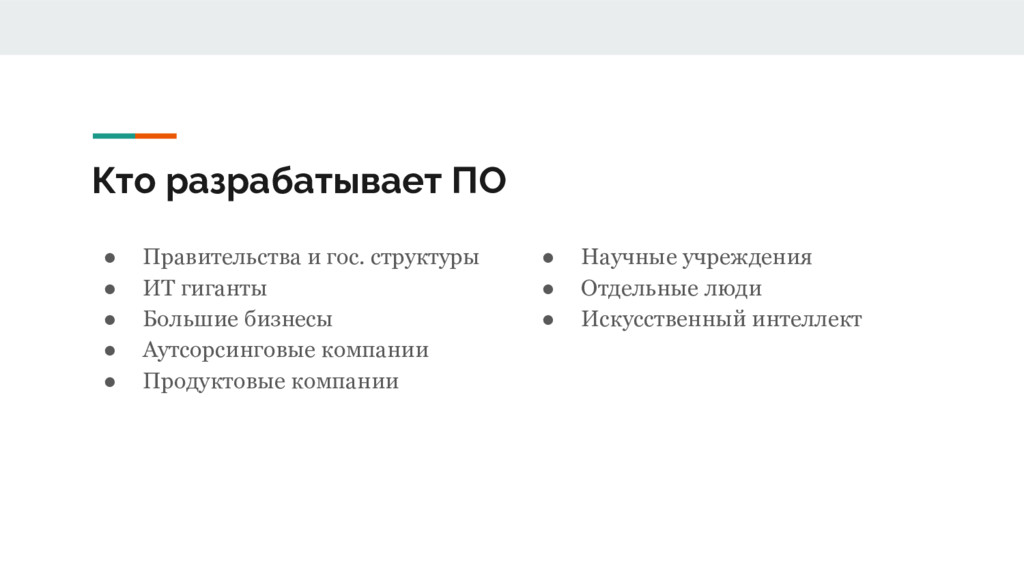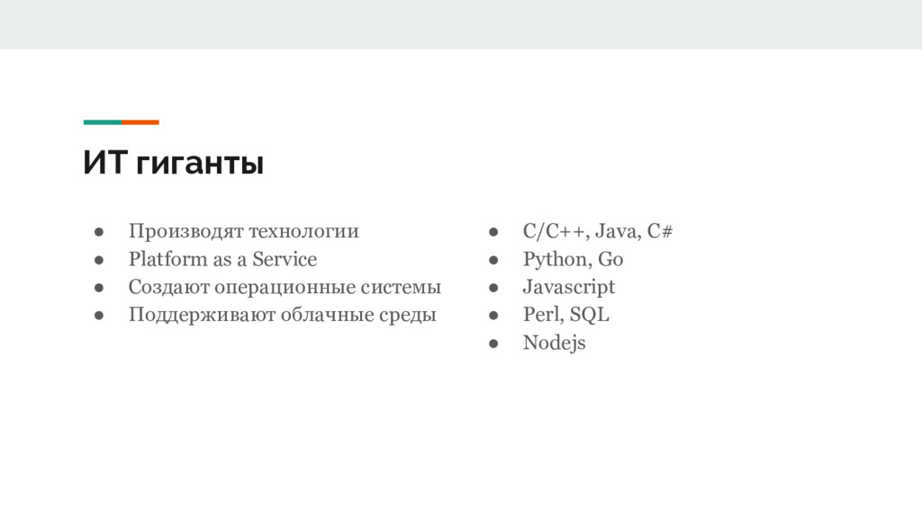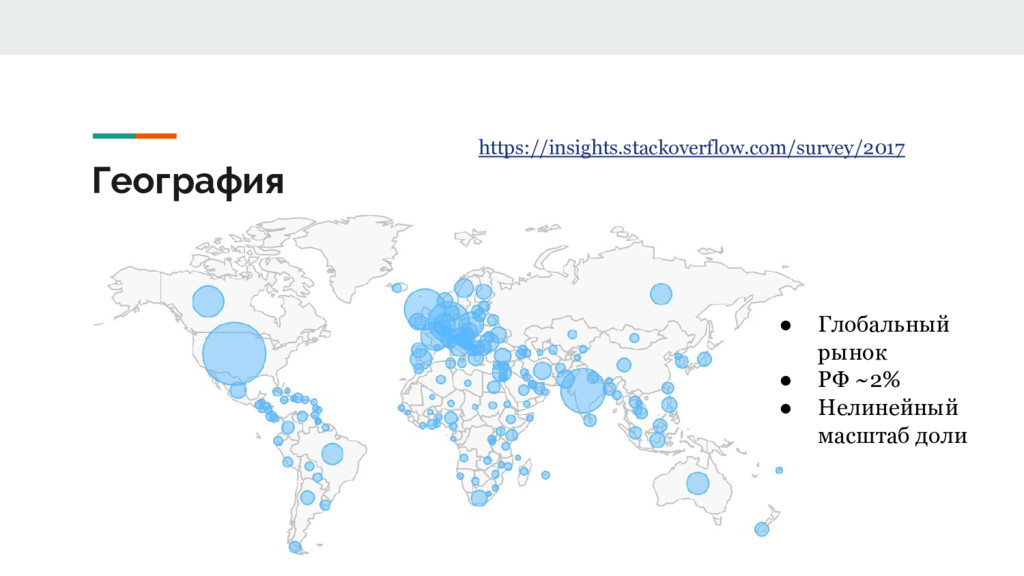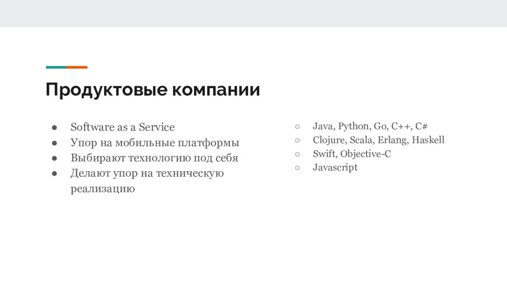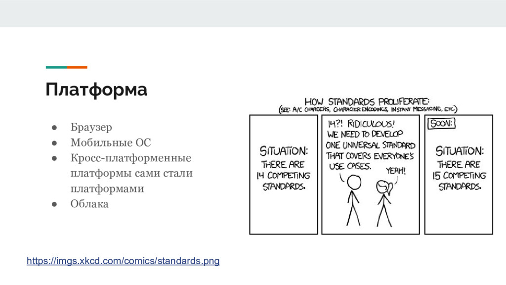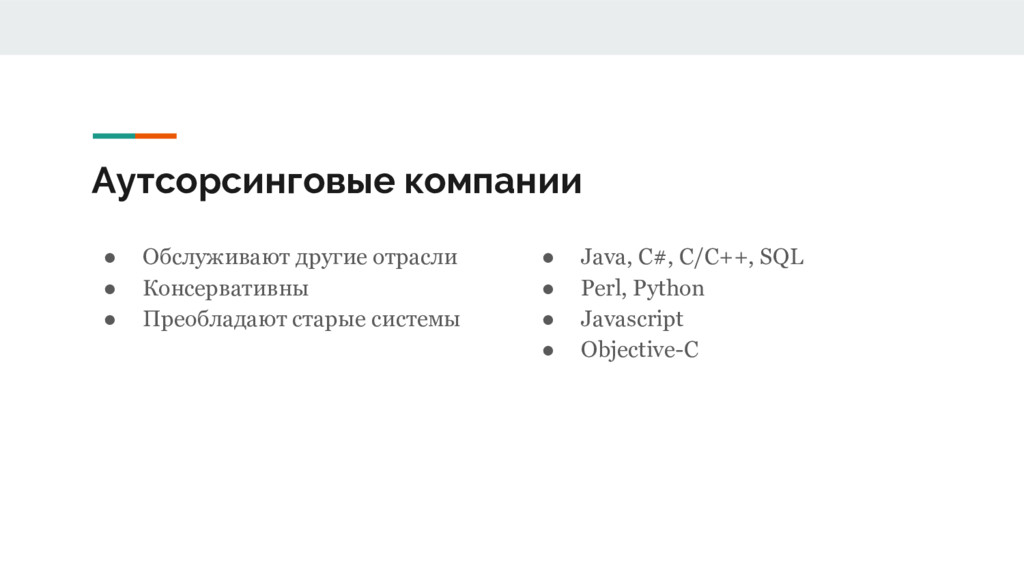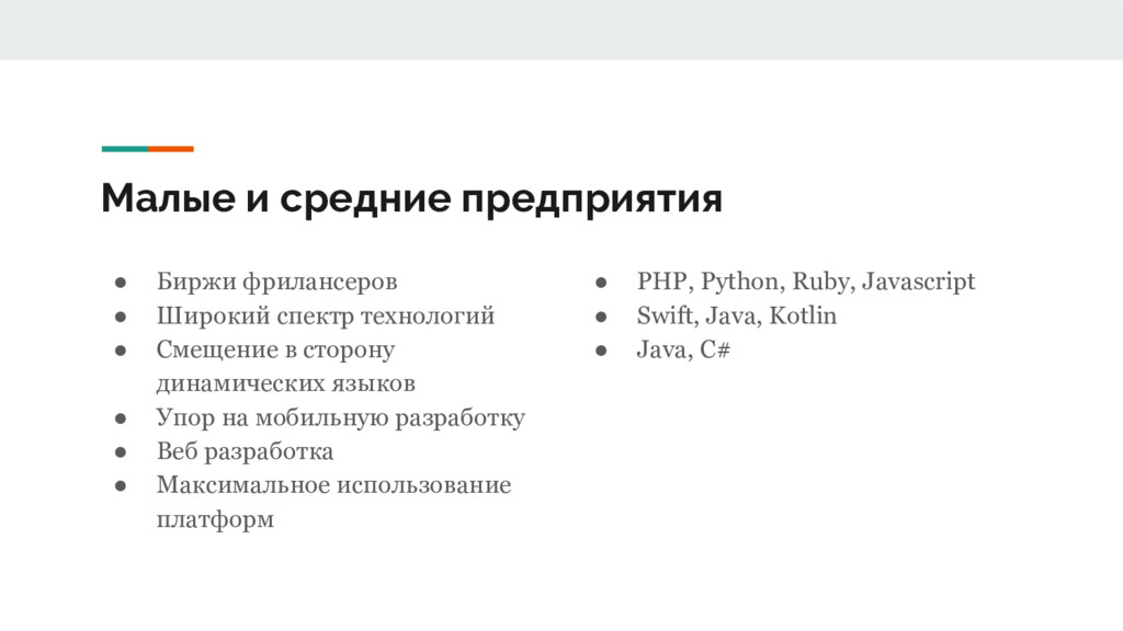 технологий • Смещение в сторону динамических языков • Упор на мобильную разработку • Веб разработка • Максимальное использование платформ • PHP, Python, Ruby, Javascript • Swift, Java, Kotlin • Java, C#