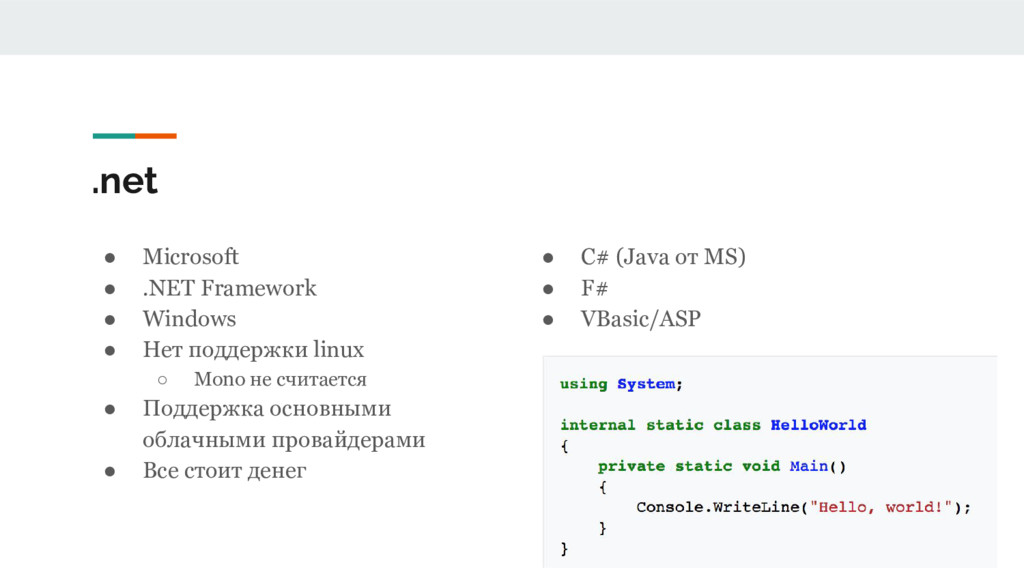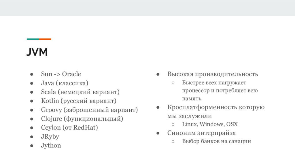 (немецкий вариант) • Kotlin (русский вариант) • Groovy (заброшенный вариант) • Clojure (функциональный) • Ceylon (от RedHat) • JRyby • Jython • Высокая производительность ◦ Быстрее всех нагружает процессор и потребляет всю память • Кросплатформенность которую мы заслужили ◦ Linux, Windows, OSX • Синоним энтерпрайза ◦ Выбор банков на санации