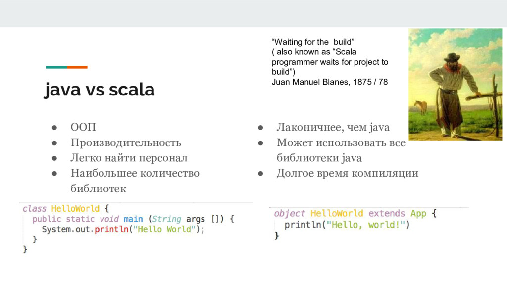 персонал • Наибольшее количество библиотек • Лаконичнее, чем java • Может использовать все библиотеки java • Долгое время компиляции “Waiting for the build” ( also known as “Scala programmer waits for project to build”) Juan Manuel Blanes, 1875 / 78
