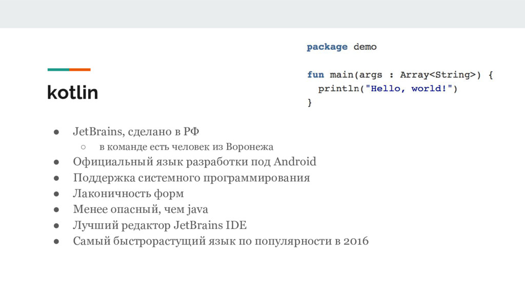 из Воронежа • Официальный язык разработки под Android • Поддержка системного программирования • Лаконичность форм • Менее опасный, чем java • Лучший редактор JetBrains IDE • Самый быстрорастущий язык по популярности в 2016 kotlin