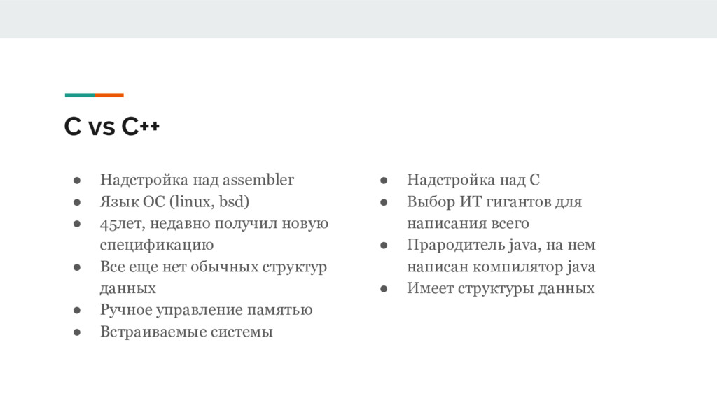 (linux, bsd) • 45лет, недавно получил новую спецификацию • Все еще нет обычных структур данных • Ручное управление памятью • Встраиваемые системы • Надстройка над С • Выбор ИТ гигантов для написания всего • Прародитель java, на нем написан компилятор java • Имеет структуры данных