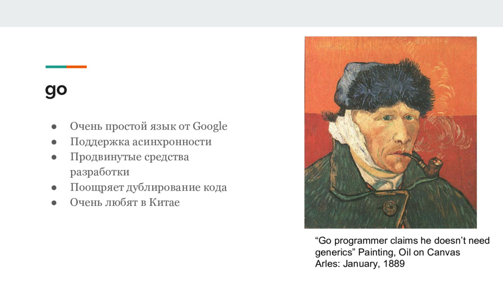 • Продвинутые средства разработки • Поощряет дублирование кода • Очень любят в Китае “Go programmer claims he doesn’t need generics” Painting, Oil on Canvas Arles: January, 1889