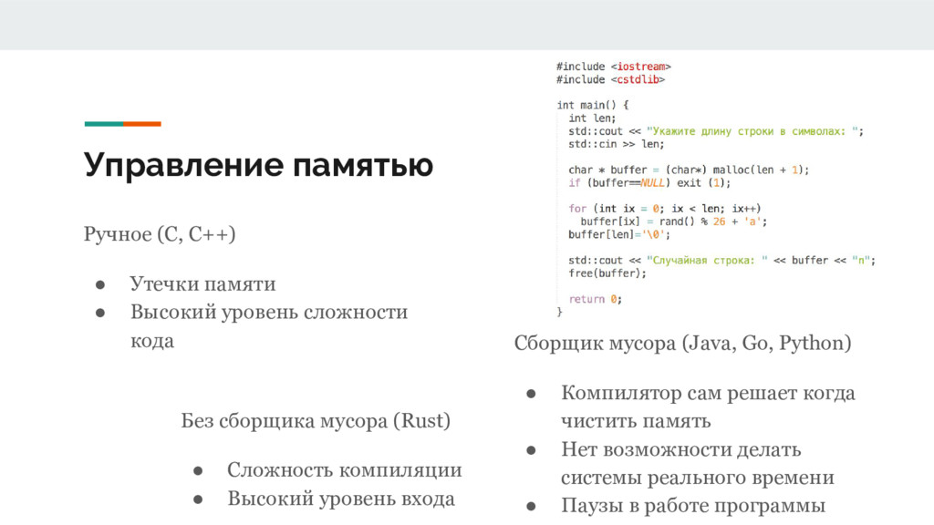 уровень сложности кода Без сборщика мусора (Rust) • Сложность компиляции • Высокий уровень входа Сборщик мусора (Java, Go, Python) • Компилятор сам решает когда чистить память • Нет возможности делать системы реального времени • Паузы в работе программы