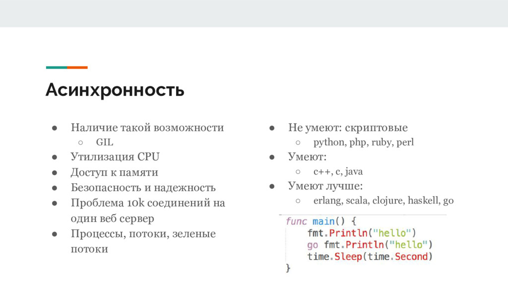 • Доступ к памяти • Безопасность и надежность • Проблема 10k соединений на один веб сервер • Процессы, потоки, зеленые потоки • Не умеют: скриптовые ◦ python, php, ruby, perl • Умеют: ◦ c++, c, java • Умеют лучше: ◦ erlang, scala, clojure, haskell, go
