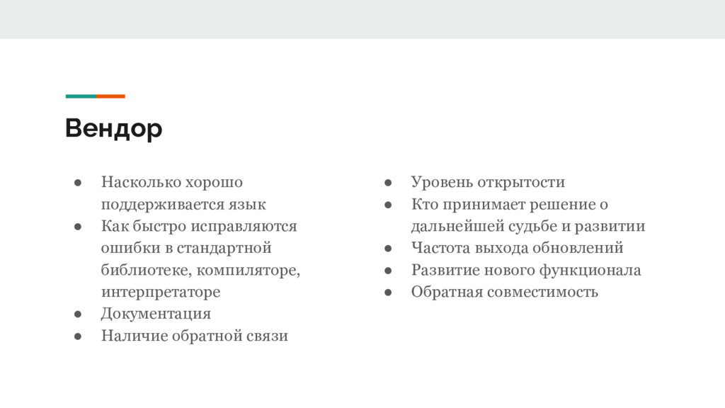 ошибки в стандартной библиотеке, компиляторе, интерпретаторе • Документация • Наличие обратной связи • Уровень открытости • Кто принимает решение о дальнейшей судьбе и развитии • Частота выхода обновлений • Развитие нового функционала • Обратная совместимость