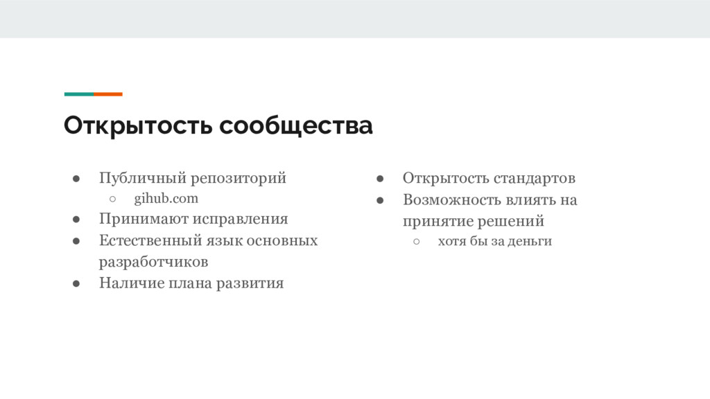 • Естественный язык основных разработчиков • Наличие плана развития • Открытость стандартов • Возможность влиять на принятие решений ◦ хотя бы за деньги