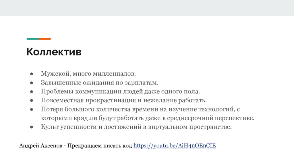 • Проблемы коммуникации людей даже одного пола. • Повсеместная прокрастинация и нежелание работать. • Потеря большого количества времени на изучение технологий, с которыми вряд ли будут работать даже в среднесрочной перспективе. • Культ успешности и достижений в виртуальном пространстве. Андрей Аксенов - Прекращаем писать код https://youtu.be/AiH4nOEnCIE