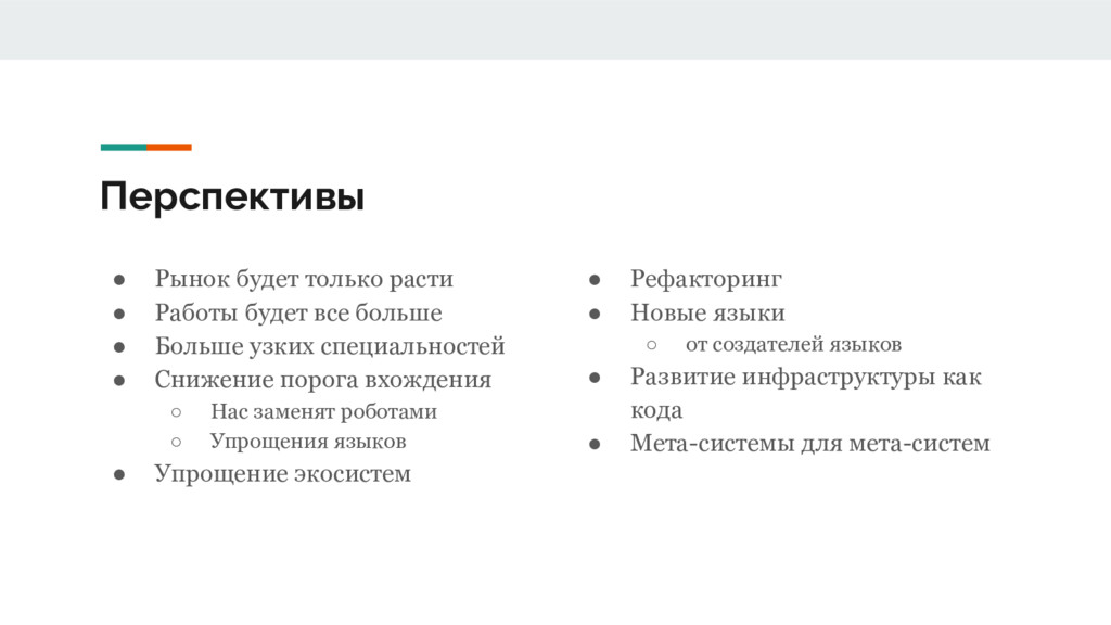 больше • Больше узких специальностей • Снижение порога вхождения ◦ Нас заменят роботами ◦ Упрощения языков • Упрощение экосистем • Рефакторинг • Новые языки ◦ от создателей языков • Развитие инфраструктуры как кода • Мета-системы для мета-систем