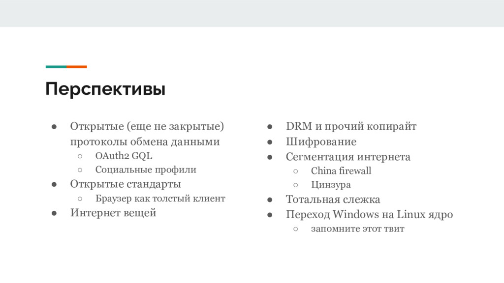 OAuth2 GQL ◦ Социальные профили • Открытые стандарты ◦ Браузер как толстый клиент • Интернет вещей • DRM и прочий копирайт • Шифрование • Сегментация интернета ◦ China firewall ◦ Цинзура • Тотальная слежка • Переход Windows на Linux ядро ◦ запомните этот твит