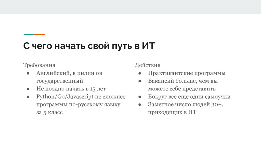 в индии он государственный • Не поздно начать в 15 лет • Python/Go/Javascript не сложнее программы по-русскому языку за 5 класс Действия • Практикантские программы • Вакансий больше, чем вы можете себе представить • Вокруг все еще одни самоучки • Заметное число людей 30+, приходящих в ИТ