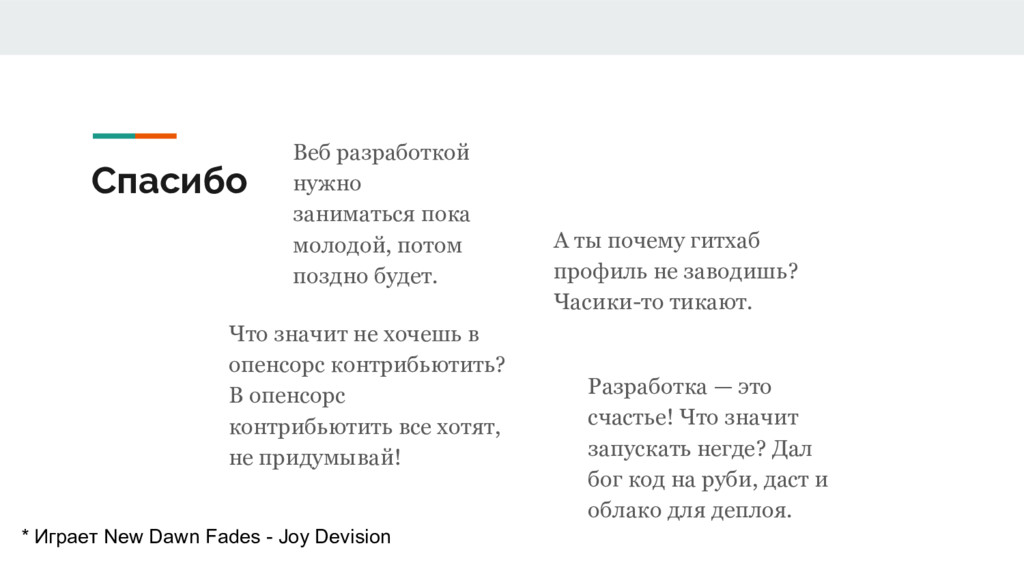 бог код на руби, даст и облако для деплоя. * Играет New Dawn Fades - Joy Devision Веб разработкой нужно заниматься пока молодой, потом поздно будет. Что значит не хочешь в опенсорс контрибьютить? В опенсорс контрибьютить все хотят, не придумывай! А ты почему гитхаб профиль не заводишь? Часики-то тикают.