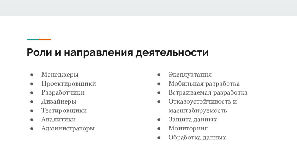 • Дизайнеры • Тестировщики • Аналитики • Администраторы • Эксплуатация • Мобильная разработка • Встраиваемая разработка • Отказоустойчивость и масштабируемость • Защита данных • Мониторинг • Обработка данных