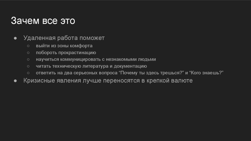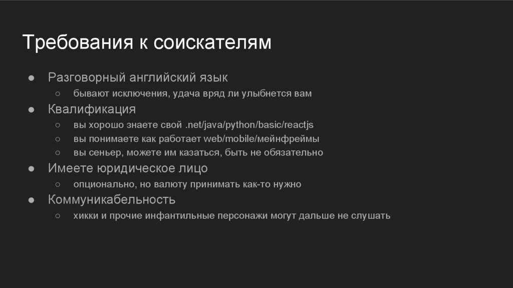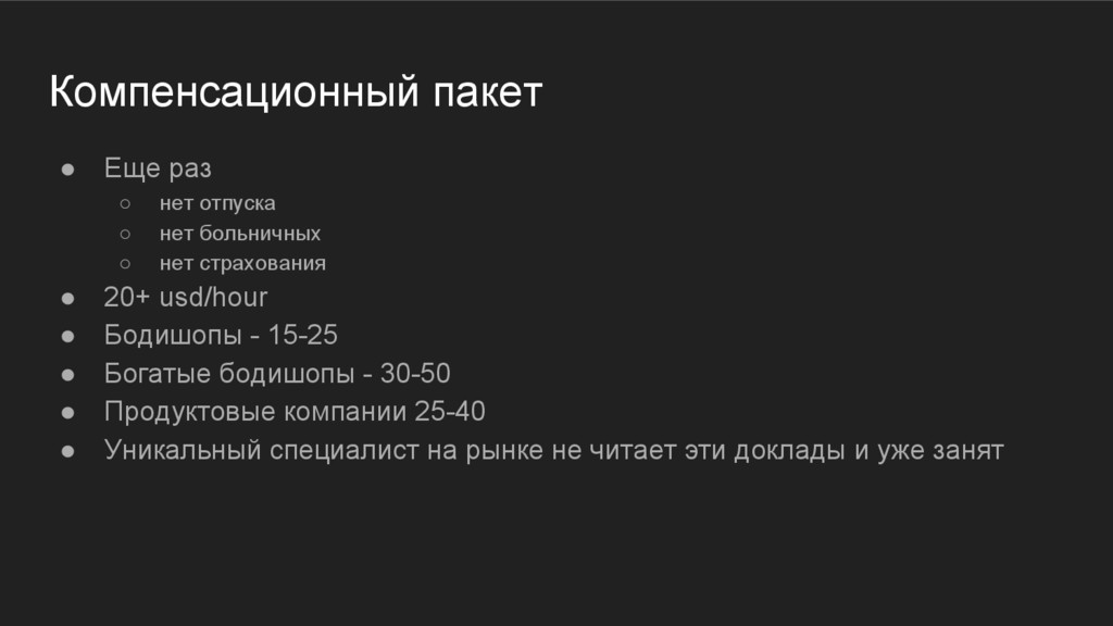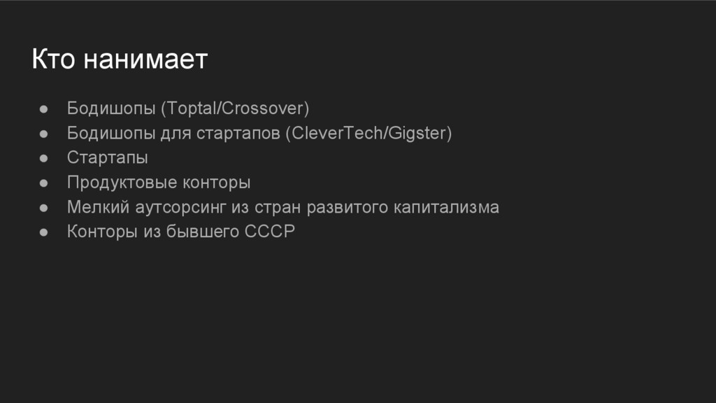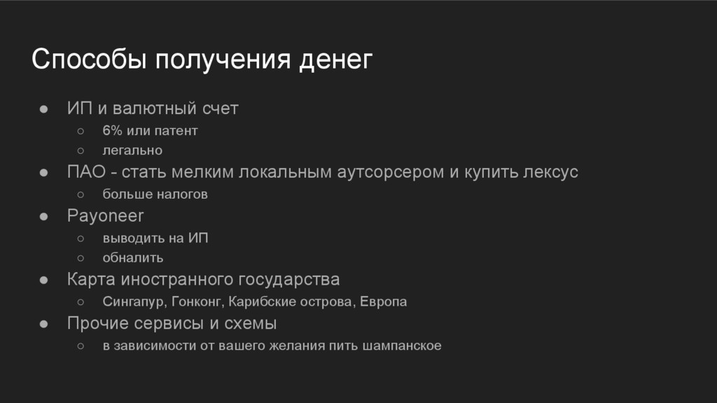 или патент ◦ легально • ПАО - стать мелким локальным аутсорсером и купить лексус ◦ больше налогов • Payoneer ◦ выводить на ИП ◦ обналить • Карта иностранного государства ◦ Сингапур, Гонконг, Карибские острова, Европа • Прочие сервисы и схемы ◦ в зависимости от вашего желания пить шампанское