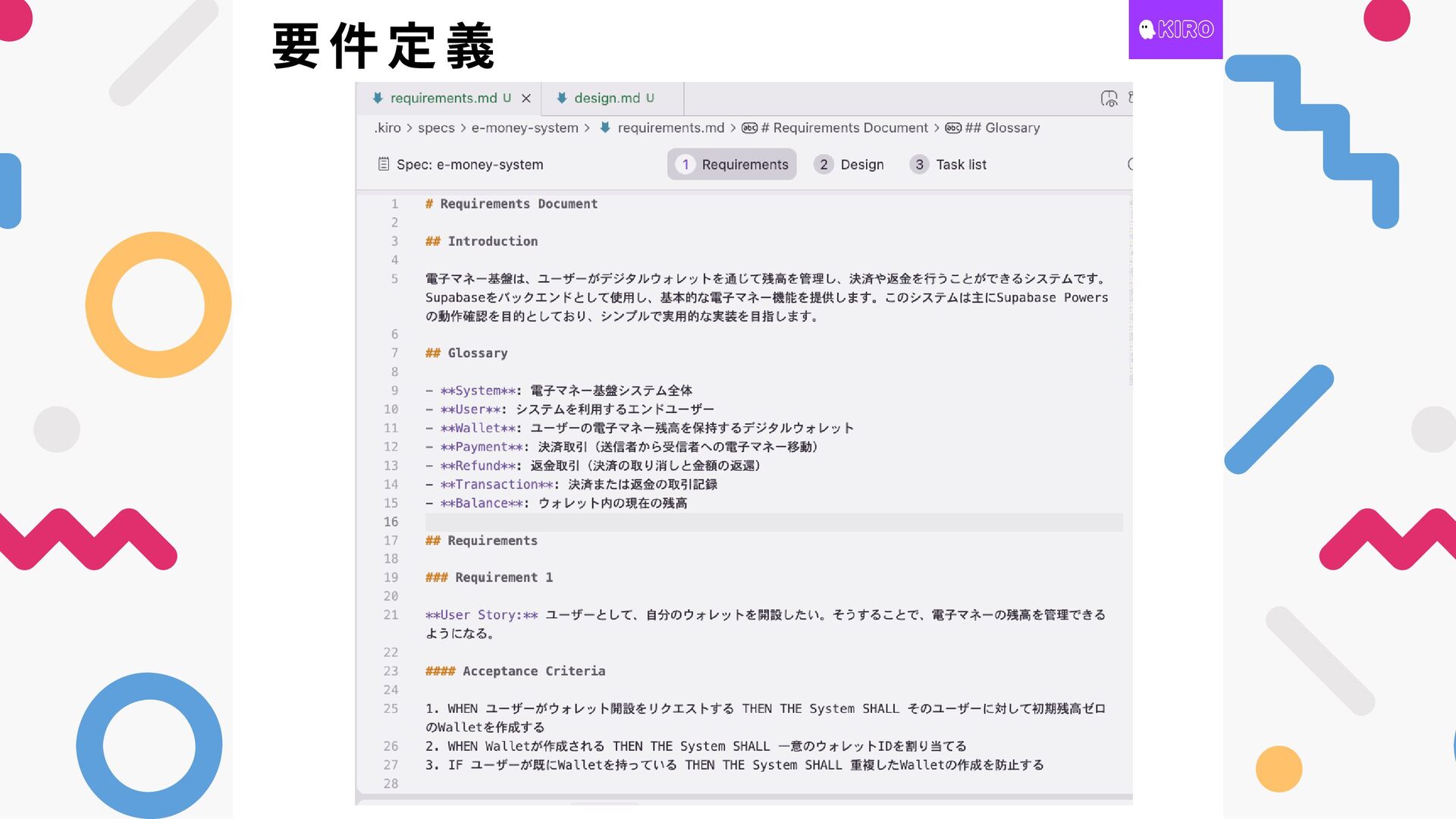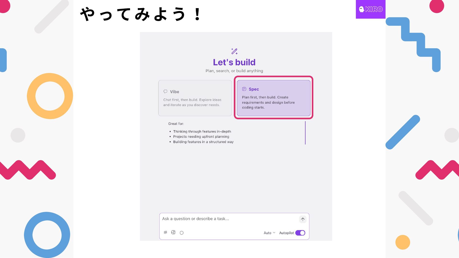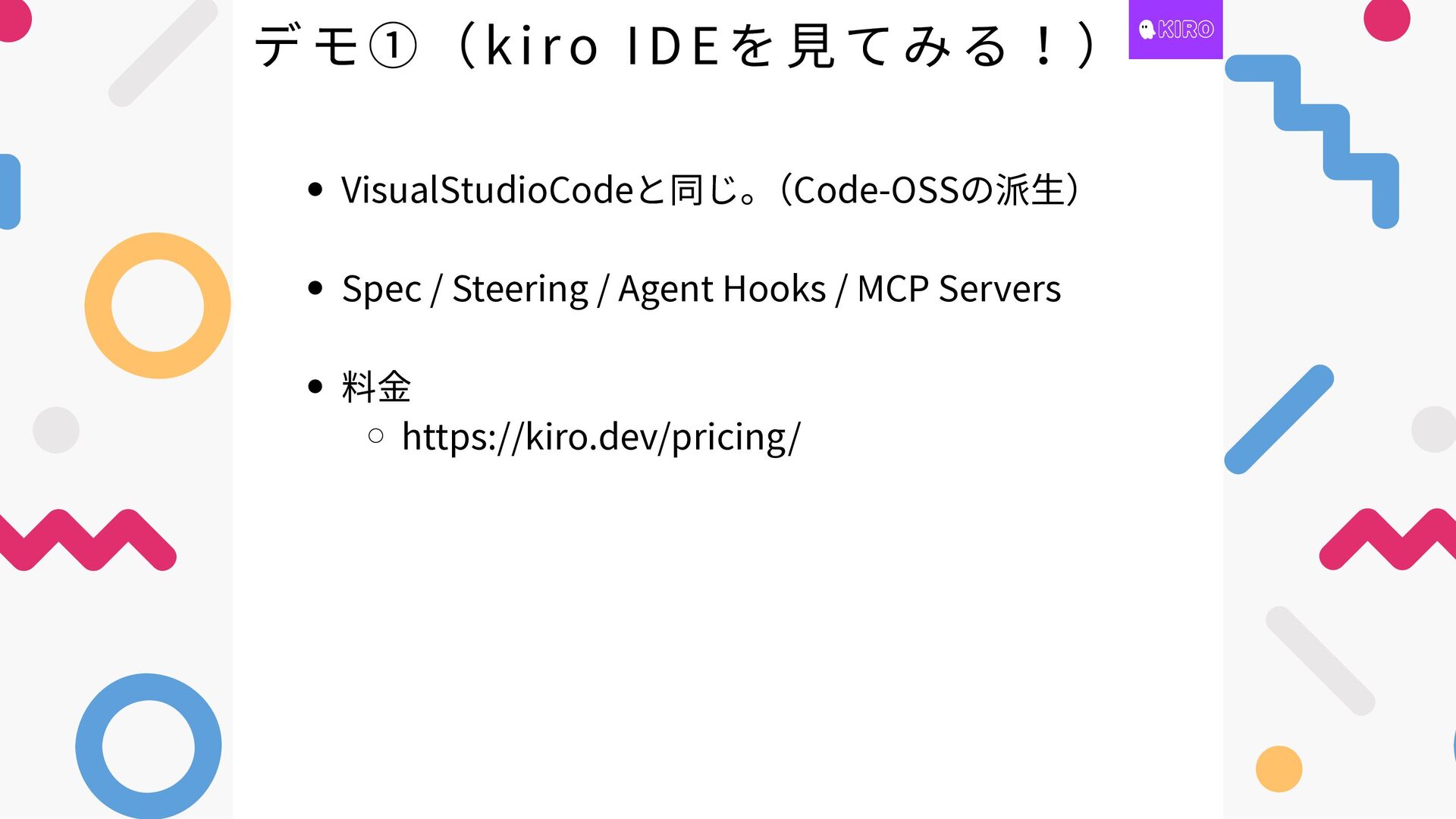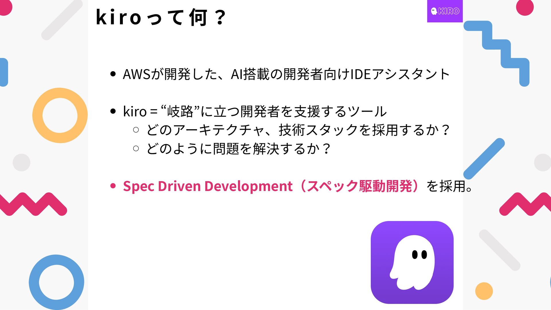 kiroって何? AWSが開発した、AI搭載の開発者向けIDEアシスタント kiro = “岐路”に立つ開発者を支援するツール どのアーキテクチャ、技術スタックを採用するか? どのように問題を解決するか? Spec Driven Development(スペック駆動開発)を採用。