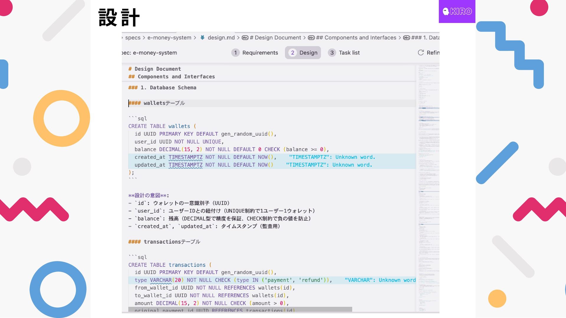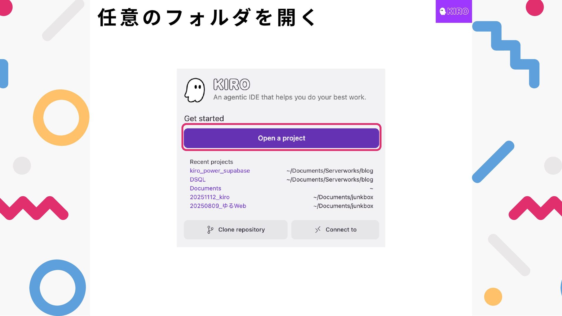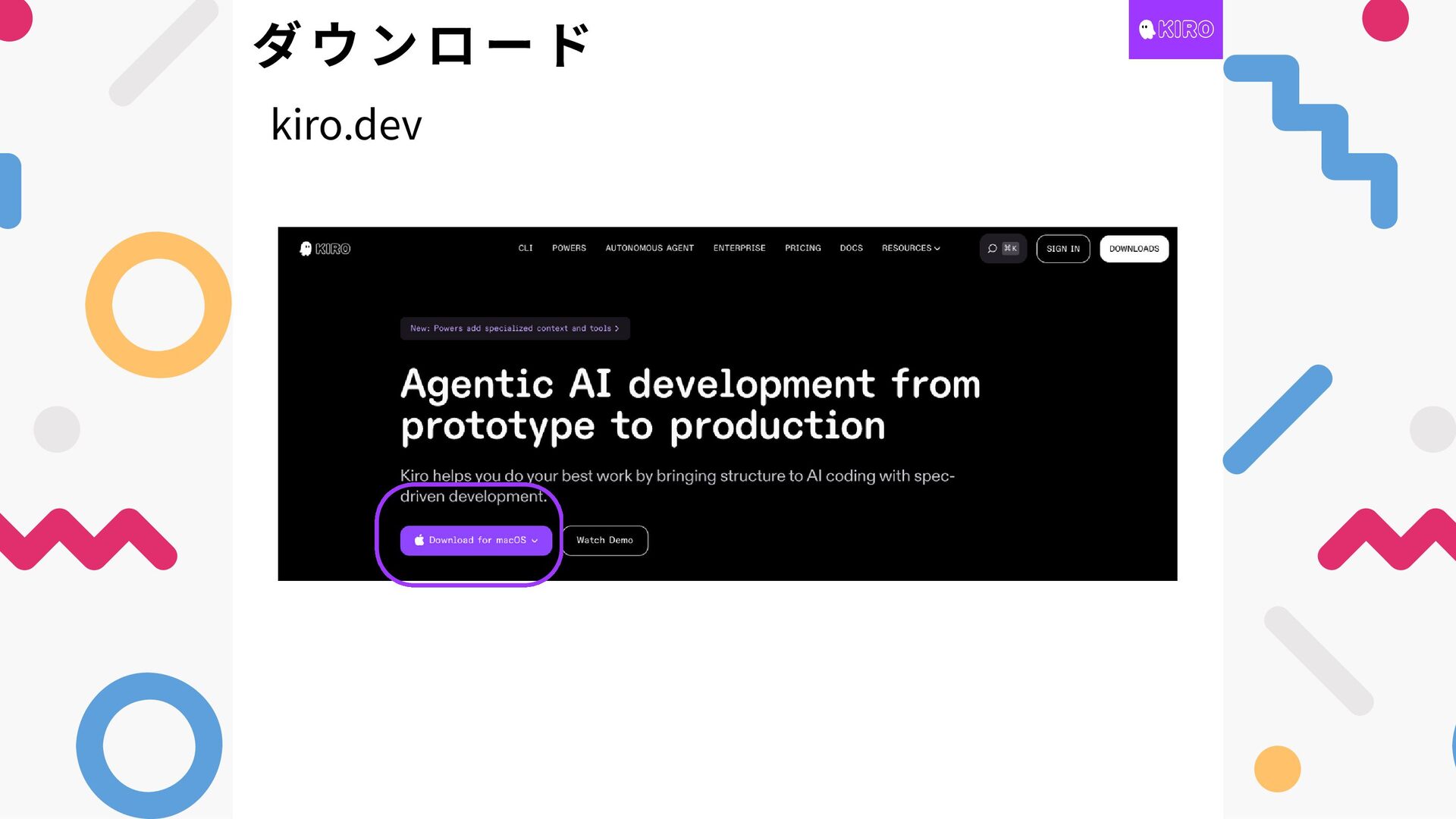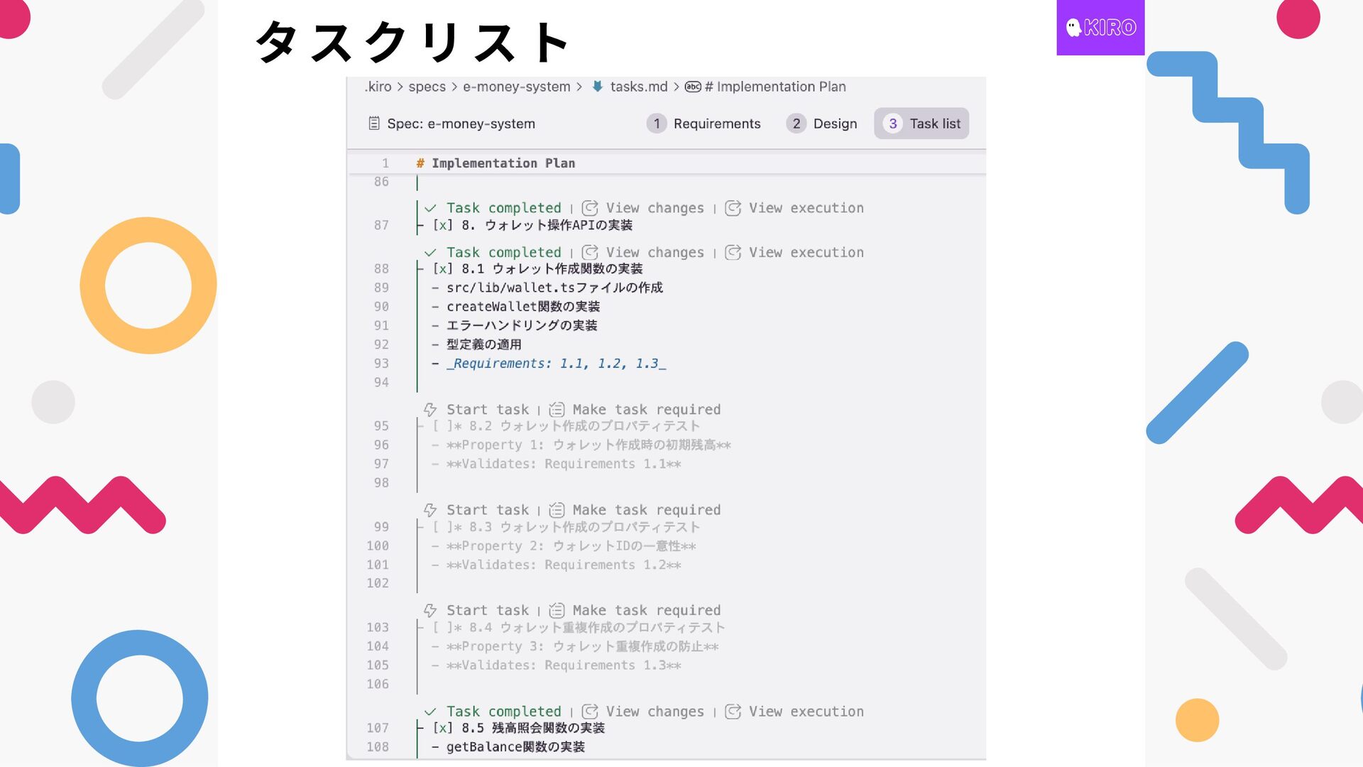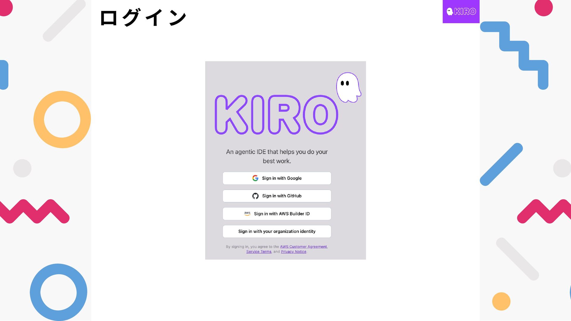 kiroって何? AWSが開発した、AI搭載の開発者向けIDEアシスタント kiro = “岐路”に立つ開発者を支援するツール どのアーキテクチャ、技術スタックを採用するか? どのように問題を解決するか? Spec Driven Development(スペック駆動開発)を採用。