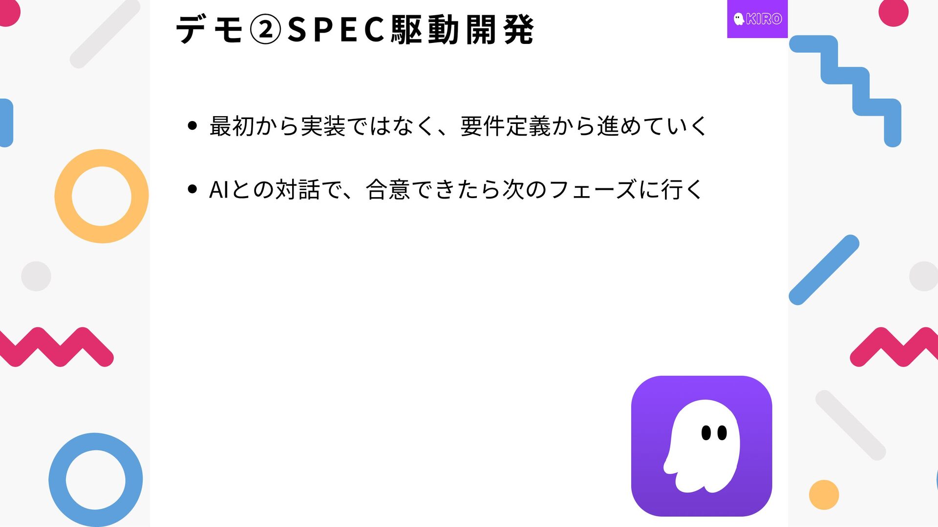 デモ②SPEC駆動開発 最初から実装ではなく、要件定義から進めていく AIとの対話で、合意できたら次のフェーズに行く
