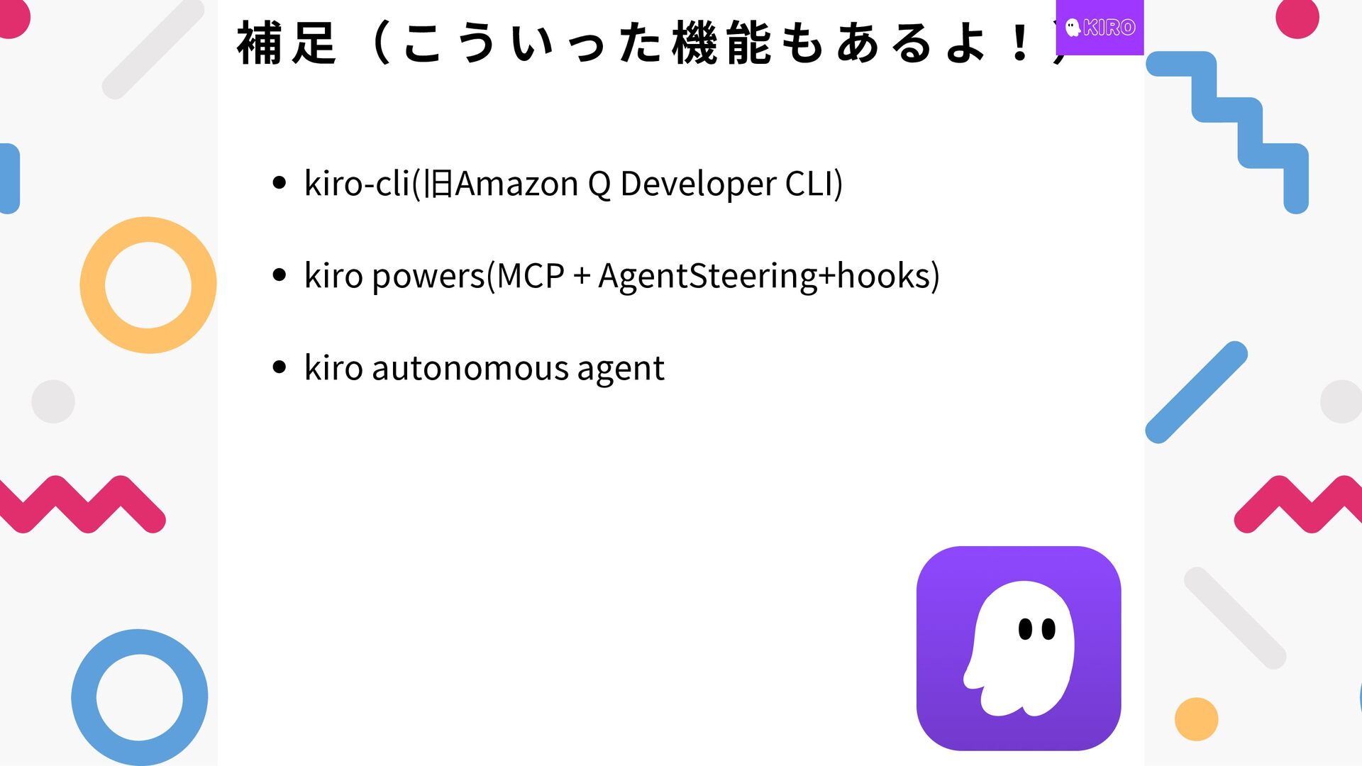 補足(こういった機能もあるよ!) kiro-cli(旧Amazon Q Developer CLI) kiro powers(MCP + AgentSteering+hooks) kiro