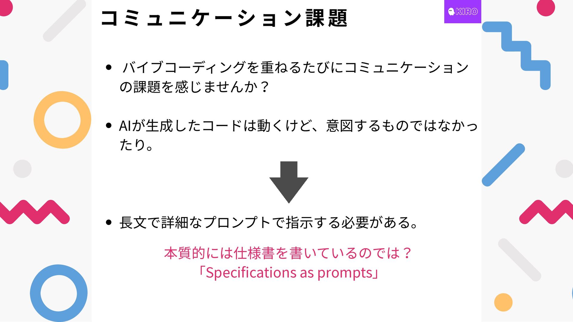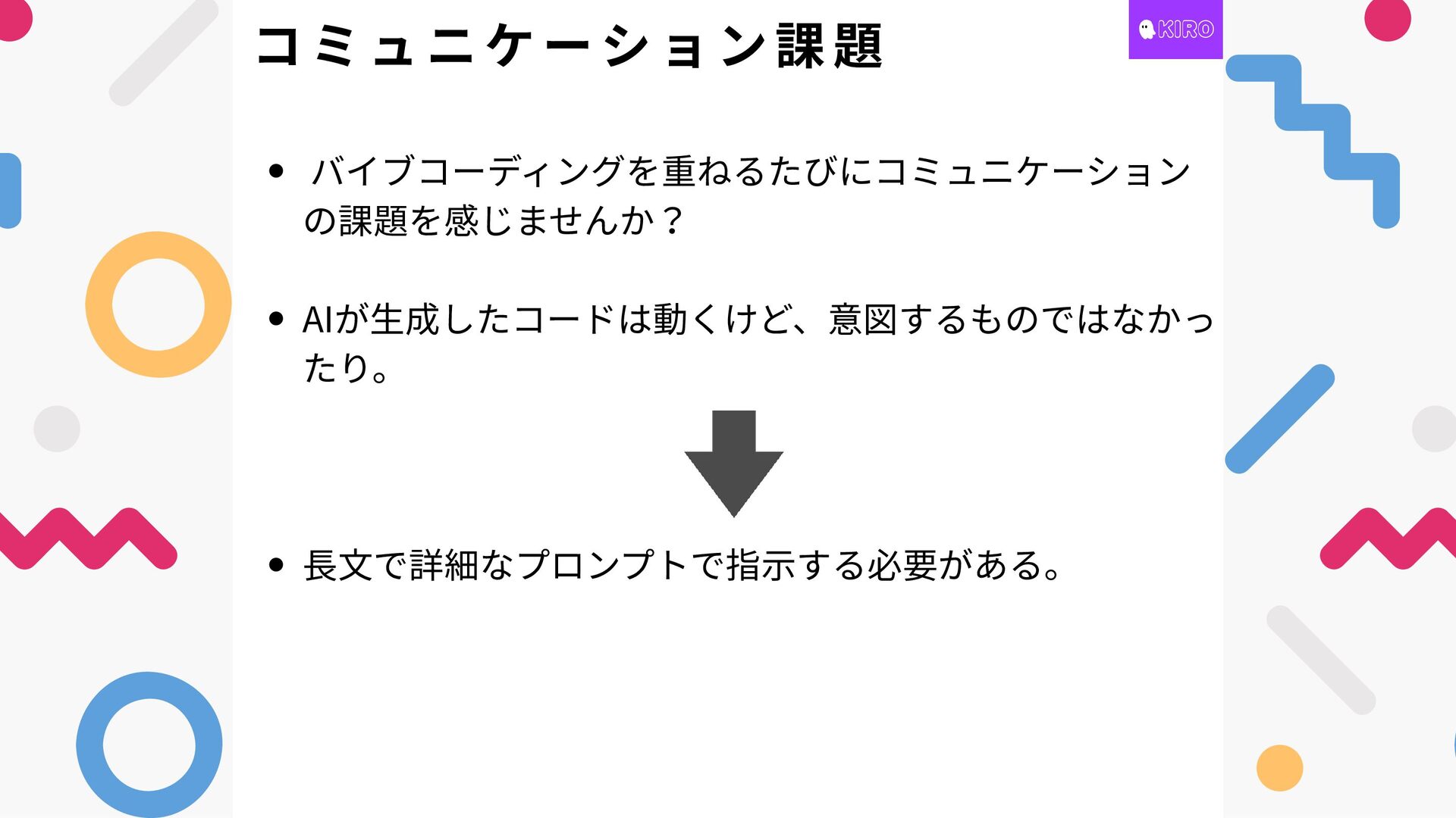 バイブコーディングを重ねるたびにコミュニケーション の課題を感じませんか? AIが生成したコードは動くけど、意図するものではなかっ たり。 長文で詳細なプロンプトで指示する必要がある。 コミュニケーション課題 本質的には仕様書を書いているのでは? 「Specifications as prompts」