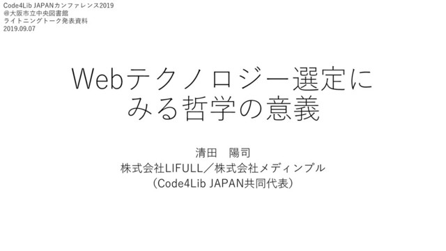 Webテクノロジー選定に みる哲学の意義 清⽥ 陽司 株式会社LIFULL/株式会社メディンプル (Code4Lib JAPAN共同代表) Code4Lib JAPANカンファレンス2019 @⼤阪市⽴中央図書館