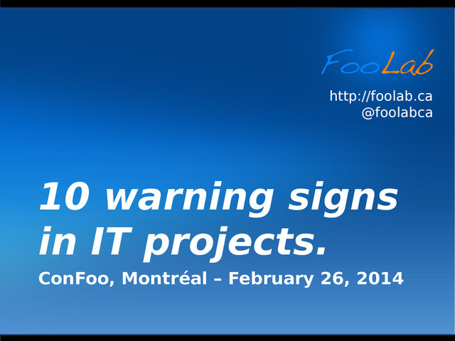 In this presentation, Yann Larrivée will explain through story telling the 10 warning signs you should look for throughout the implementation of your project in order to prevent many sleepless nights and project failure. For each warning signs one or more solutions will be given.