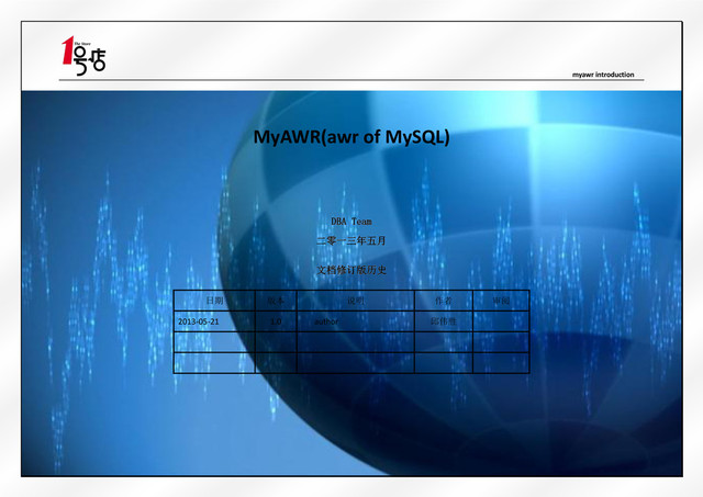 use this tool, here's what you need: 1. A MySQL database to store snapshot data and slow log analysis data . 2. pt-query-digest by percona 3. A MySQL server with perl-DBD-mysql 4. slow query logs named like slow_20130521.log,you can switch slow logs every day. 3.1 install db Connect to the MySQL database where store the performance data and issue the following command in myawr.sql: CREATE DATABASE `myawr` DEFAULT CHARACTER SET utf8; grant all on myawr.* to 'user'@'%' identified by "111111"; then create tables in db myawr.