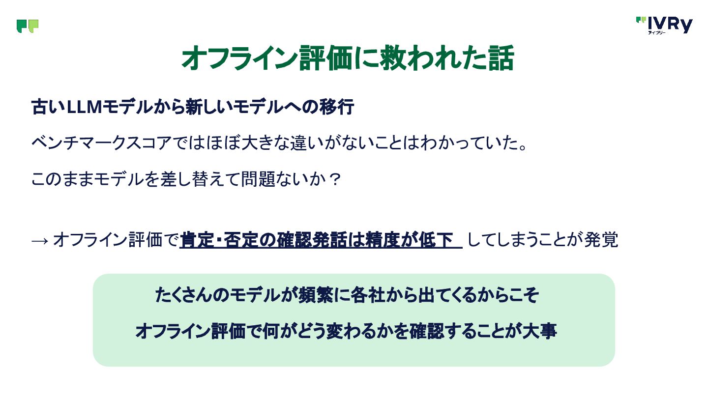 オフライン評価に救われた話 古いLLMモデルから新しいモデルへの移行 ベンチマークスコアでは新モデルが良い。このままモデルを差し替えて問題ない? → オフライン評価で肯定・否定の確認発話は精度が低下 してしまうことが発覚 (原因)