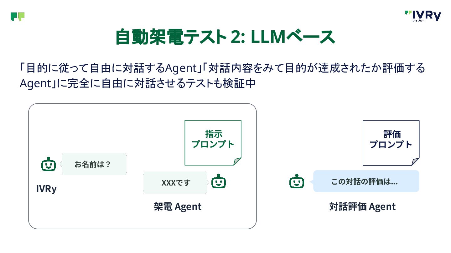 XXXです お名前は? 架電 Agent IVRy mainマージで最新ブランチを テスト環境にデプロイ ⾃動架電テスト開始 発話 シナリオ
