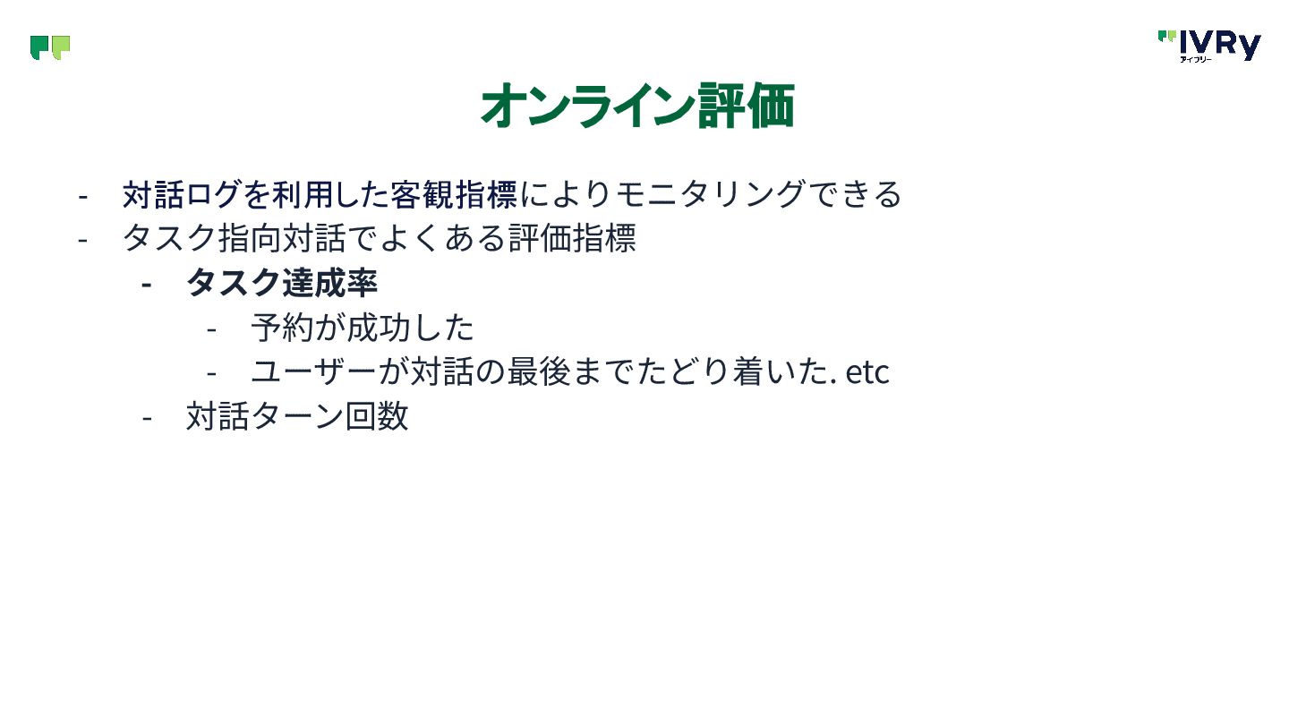オンライン評価 - 対話ログを利用した客観指標によりモニタリングできる - タスク指向対話でよくある評価指標 - タスク達成率 - 予約が成功した
