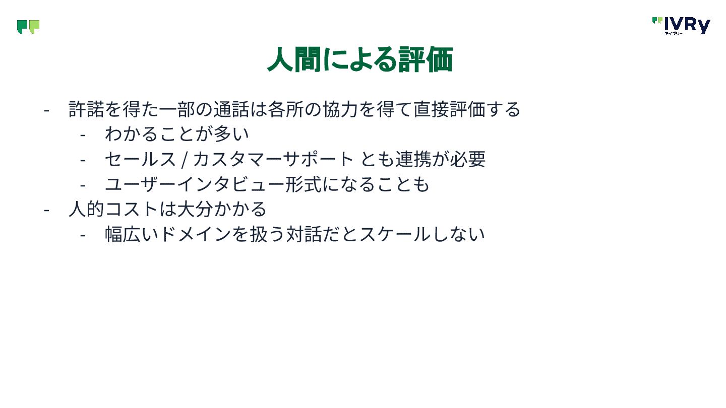 人間による評価 - 許諾を得た⼀部の通話は各所の協⼒を得て直接評価する - わかることが多い - セールス /