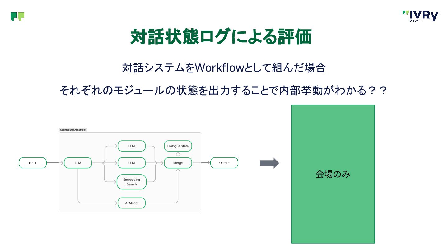 対話状態ログによる評価 対話システムをWorkflowとして組んだ場合 それぞれのモジュールの状態を出力することで内部挙動がわかる?? 会場のみ