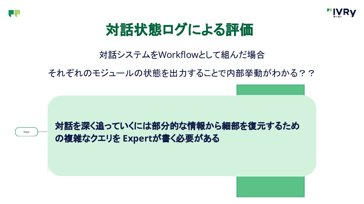 対話状態ログによる評価 対話システムをWorkflowとして組んだ場合 それぞれのモジュールの状態を出力することで内部挙動がわかる?? 会場のみ 対話を深く追っていくには部分的な情報から細部を復元するため の複雑なクエリを