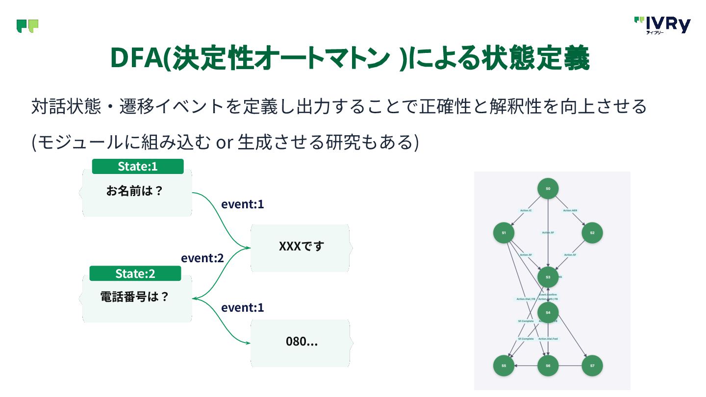 DFA(決定性オートマトン )による状態定義 XXXです 080... お名前は? 電話番号は? 対話状態‧遷移イベントを定義し出⼒することで正確性と解釈性を向上させる (モジュールに組み込む or
