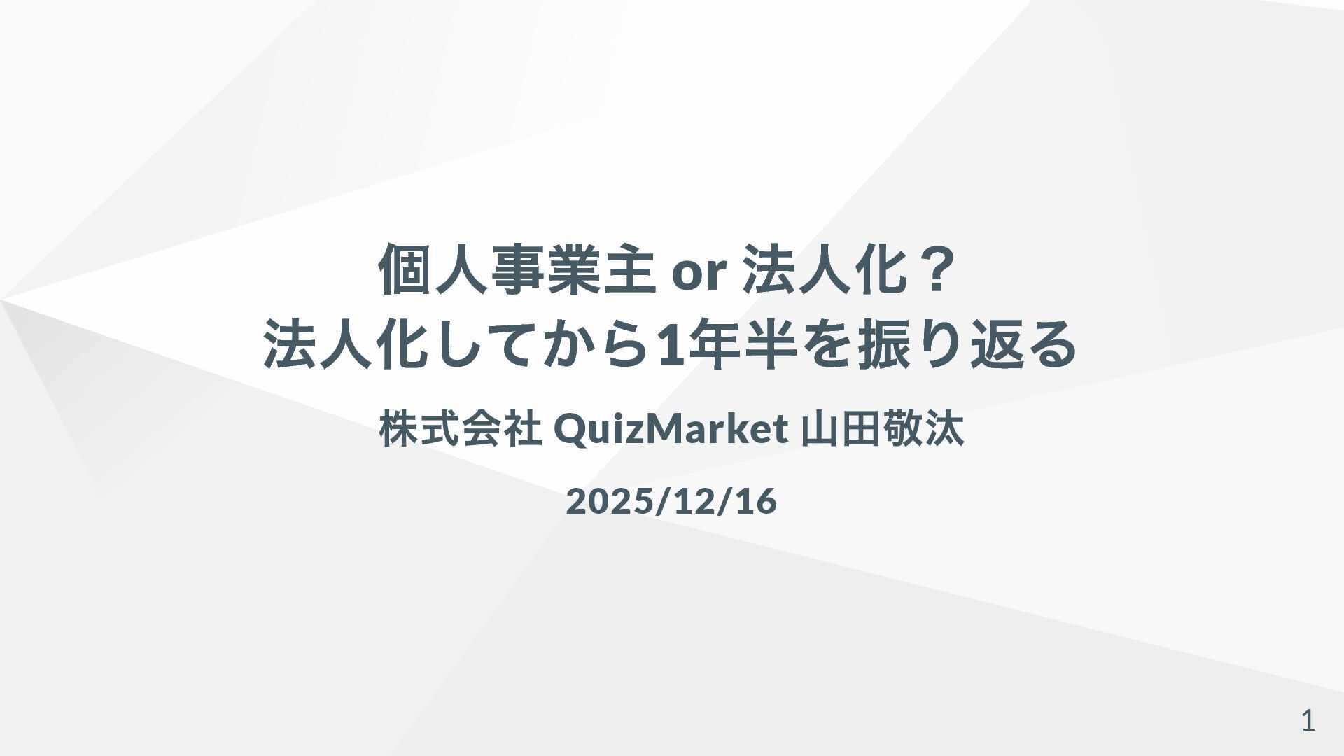 個人事業主 or 法人化? 法人化してから1 年半を振り返る 株式会社 QuizMarket 山田敬汰 2025/12/16 1