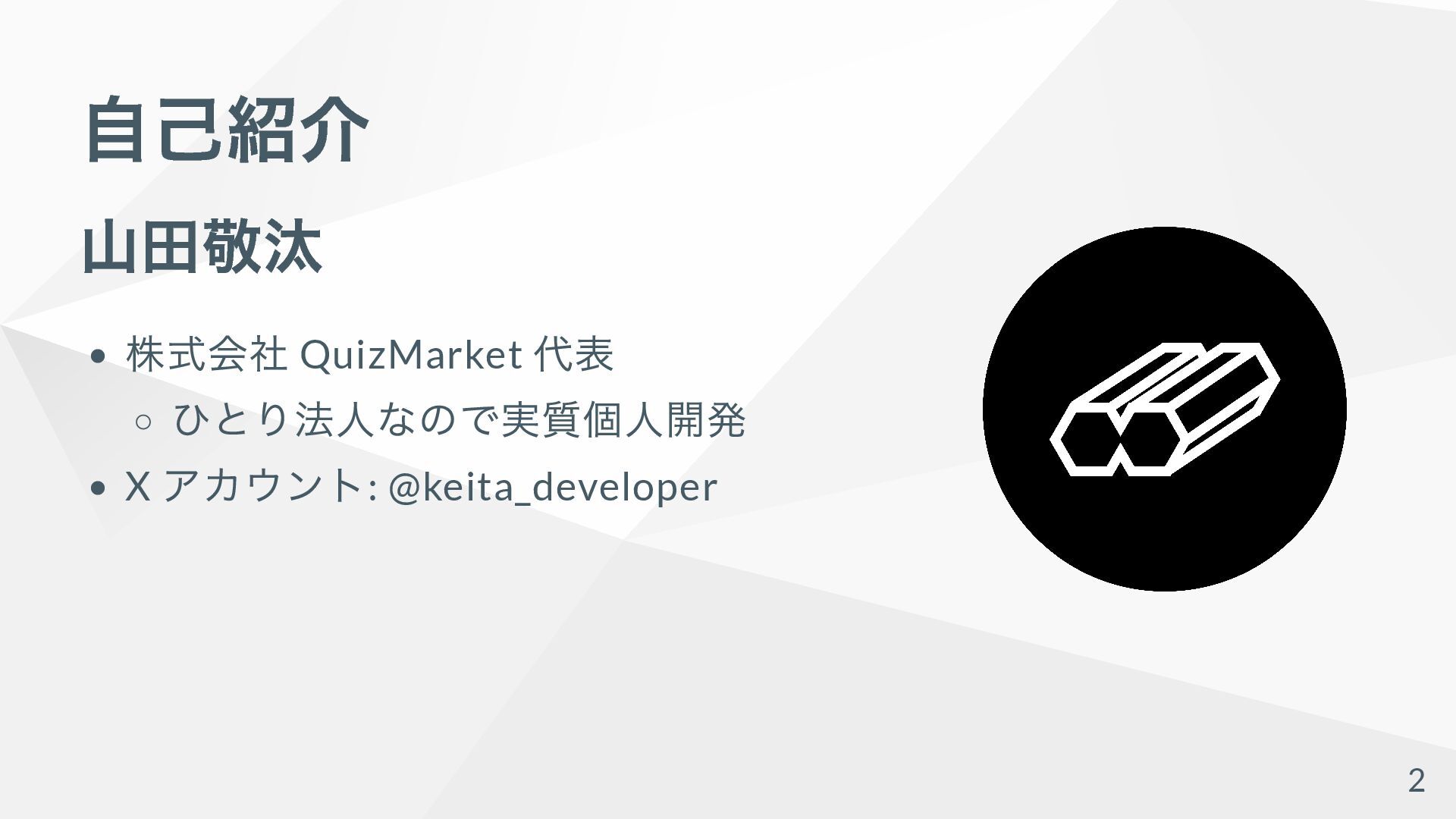 自己紹介 山田敬汰 株式会社 QuizMarket 代表 ひとり法人なので実質個人開発 X アカウント: @keita_developer 2
