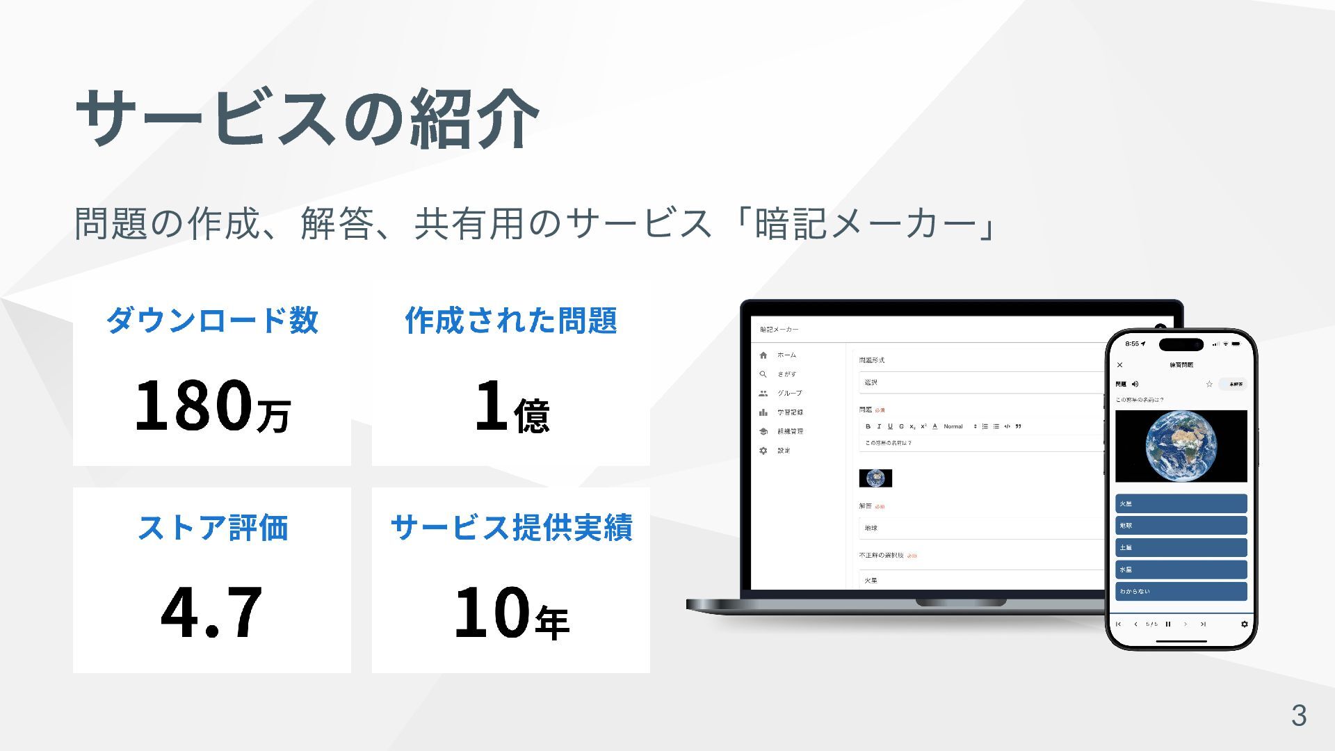 話す内容 「暗記メーカー」の事業を法人化してから1 年半経ったので、良かっ たことや大変だったことを振り返ります。 略歴 2016 年:自分のテスト勉強のために「暗記メーカー」を開発 2022 年:大学卒業 →