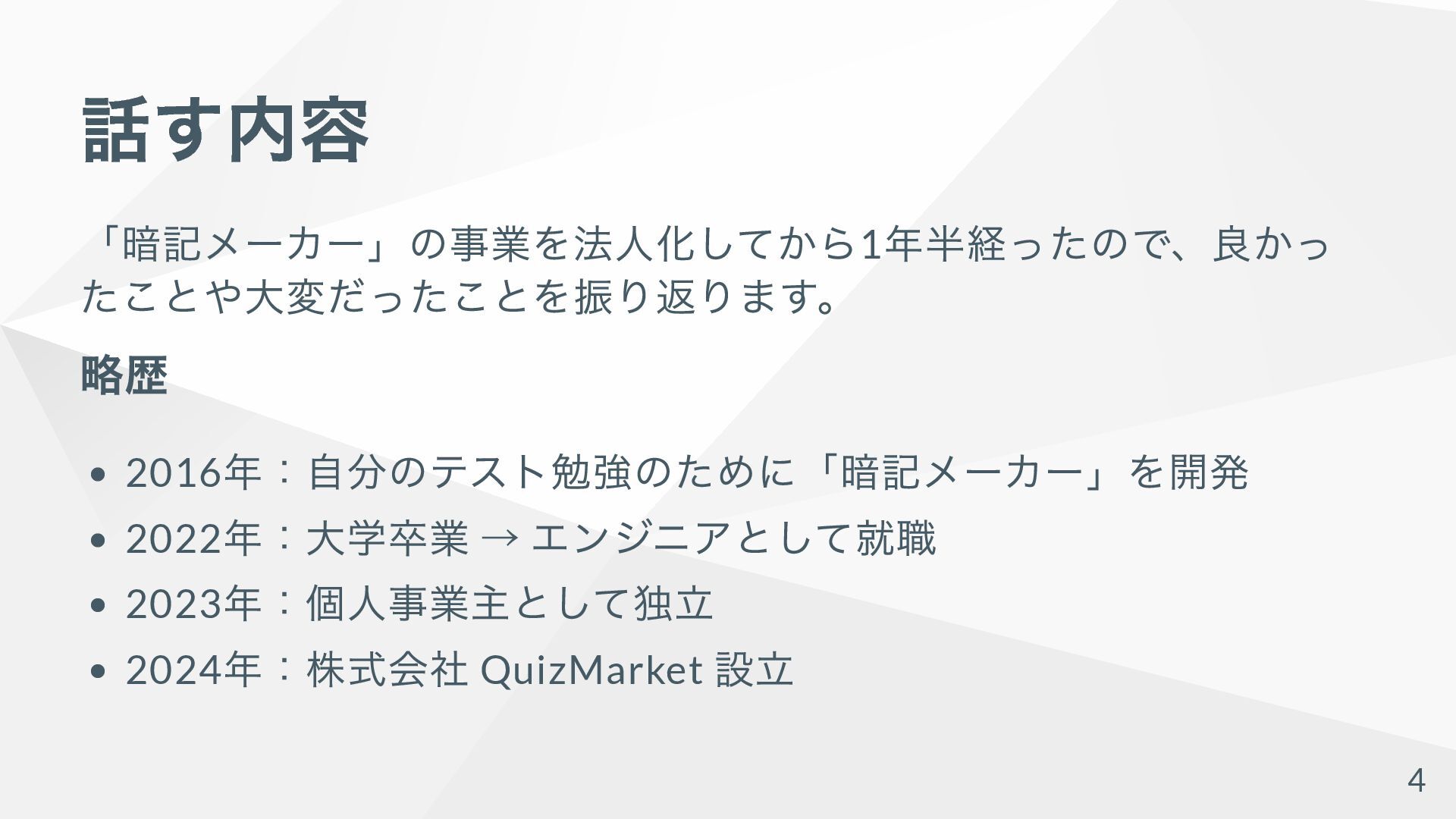 エンジニアとして就職 2023 年:個人事業主として独立 2024 年:株式会社 QuizMarket 設立 4