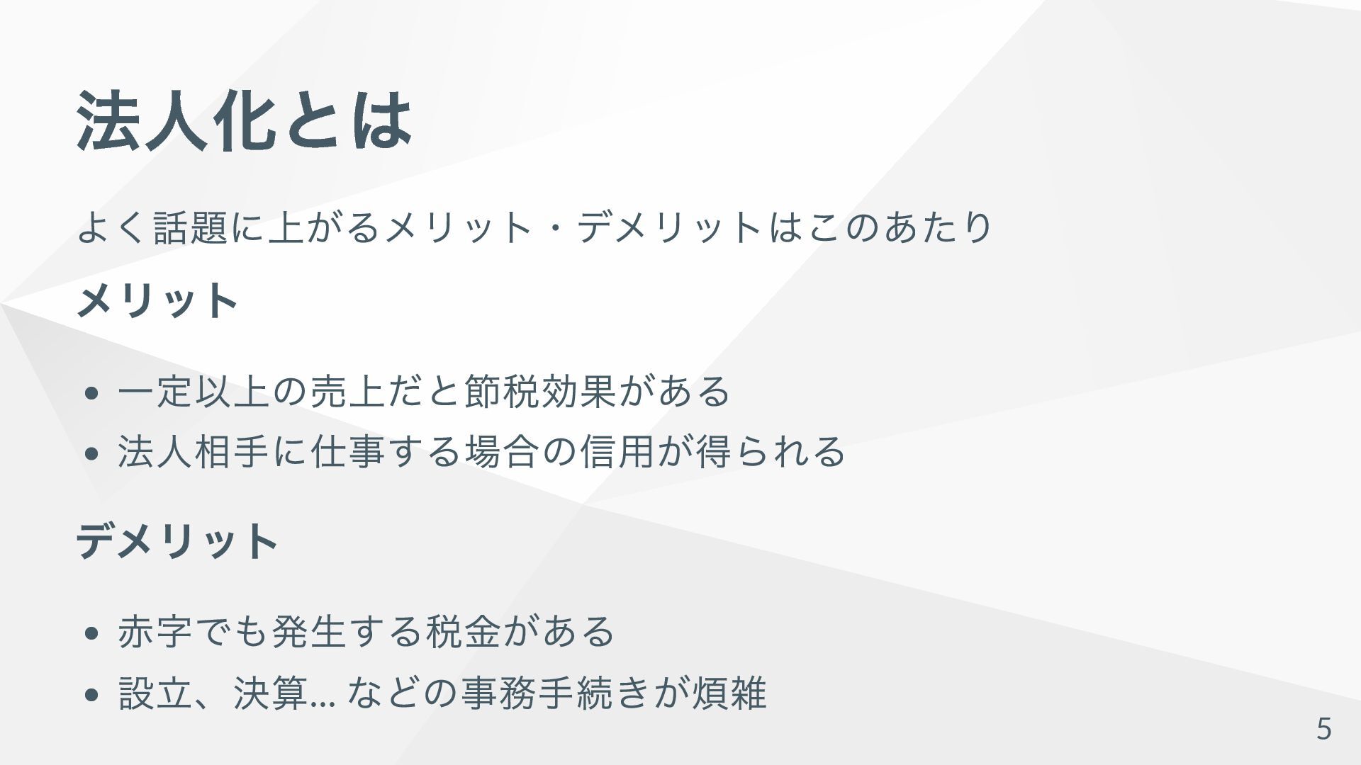 法人化とは よく話題に上がるメリット・デメリットはこのあたり メリット 一定以上の売上だと節税効果がある 法人相手に仕事する場合の信用が得られる デメリット 赤字でも発生する税金がある 設立、決算... などの事務手続きが煩雑 5