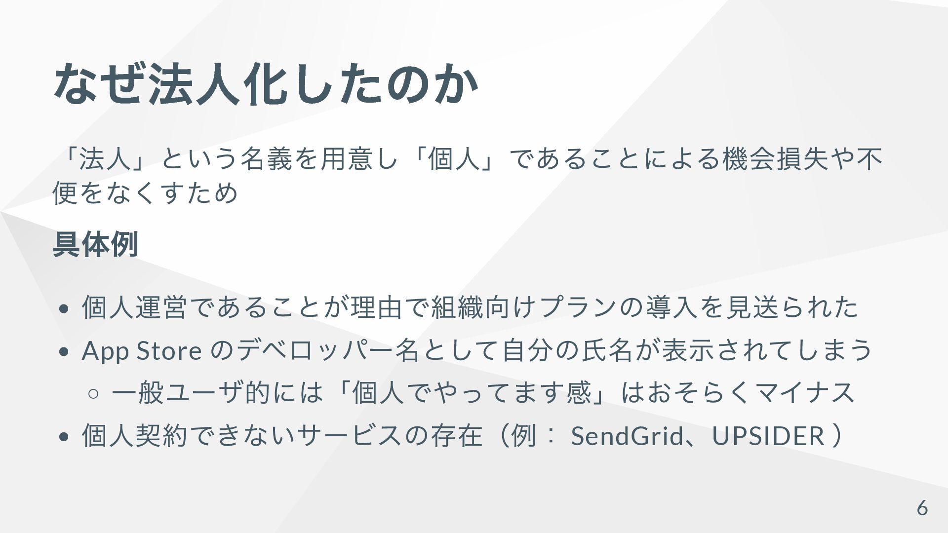 なぜ法人化したのか 「法人」という名義を用意し「個人」であることによる機会損失や不 便をなくすため 具体例 個人運営であることが理由で組織向けプランの導入を見送られた App Store のデベロッパー名として自分の氏名が表示されてしまう 一般ユーザ的には「個人でやってます感」はおそらくマイナス 個人契約できないサービスの存在(例: