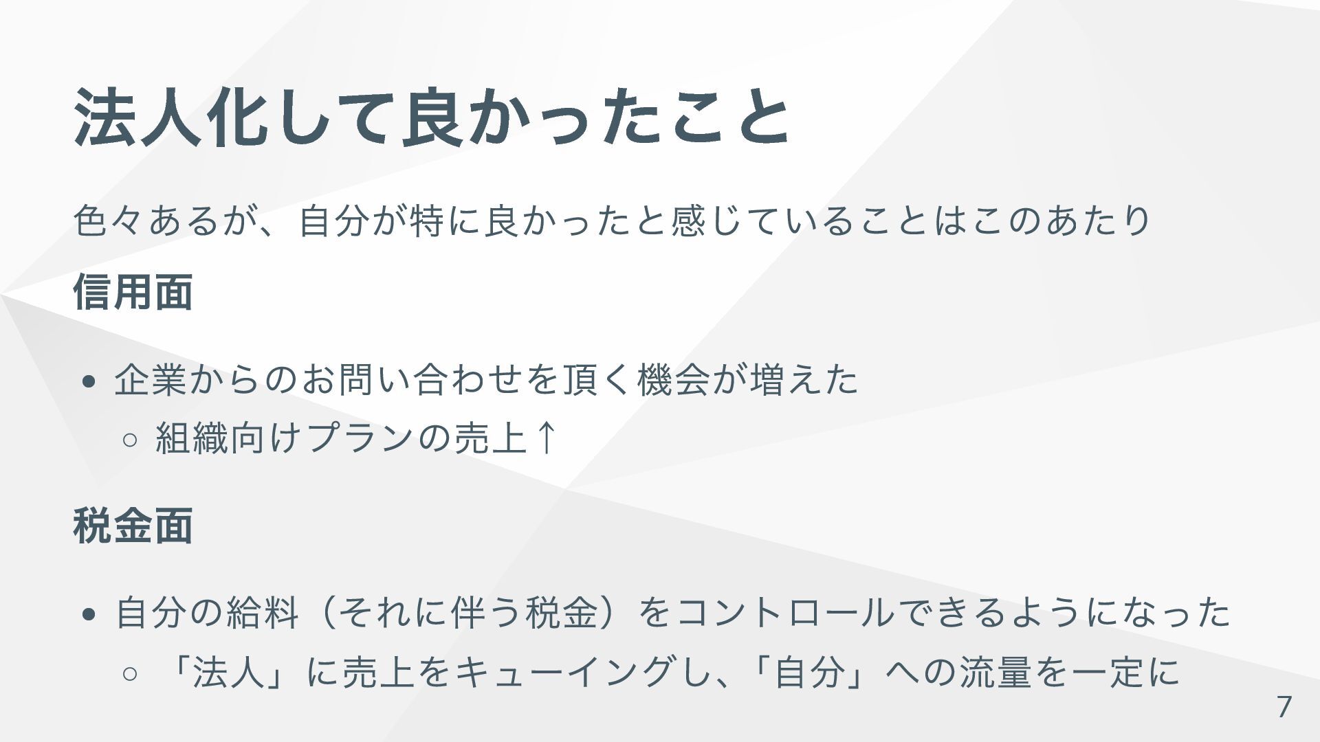 法人化して良かったこと 色々あるが、自分が特に良かったと感じていることはこのあたり 信用面 企業からのお問い合わせを頂く機会が増えた 組織向けプランの売上↑ 税金面 自分の給料(それに伴う税金)をコントロールできるようになった 「法人」に売上をキューイングし、 「自分」への流量を一定に 7