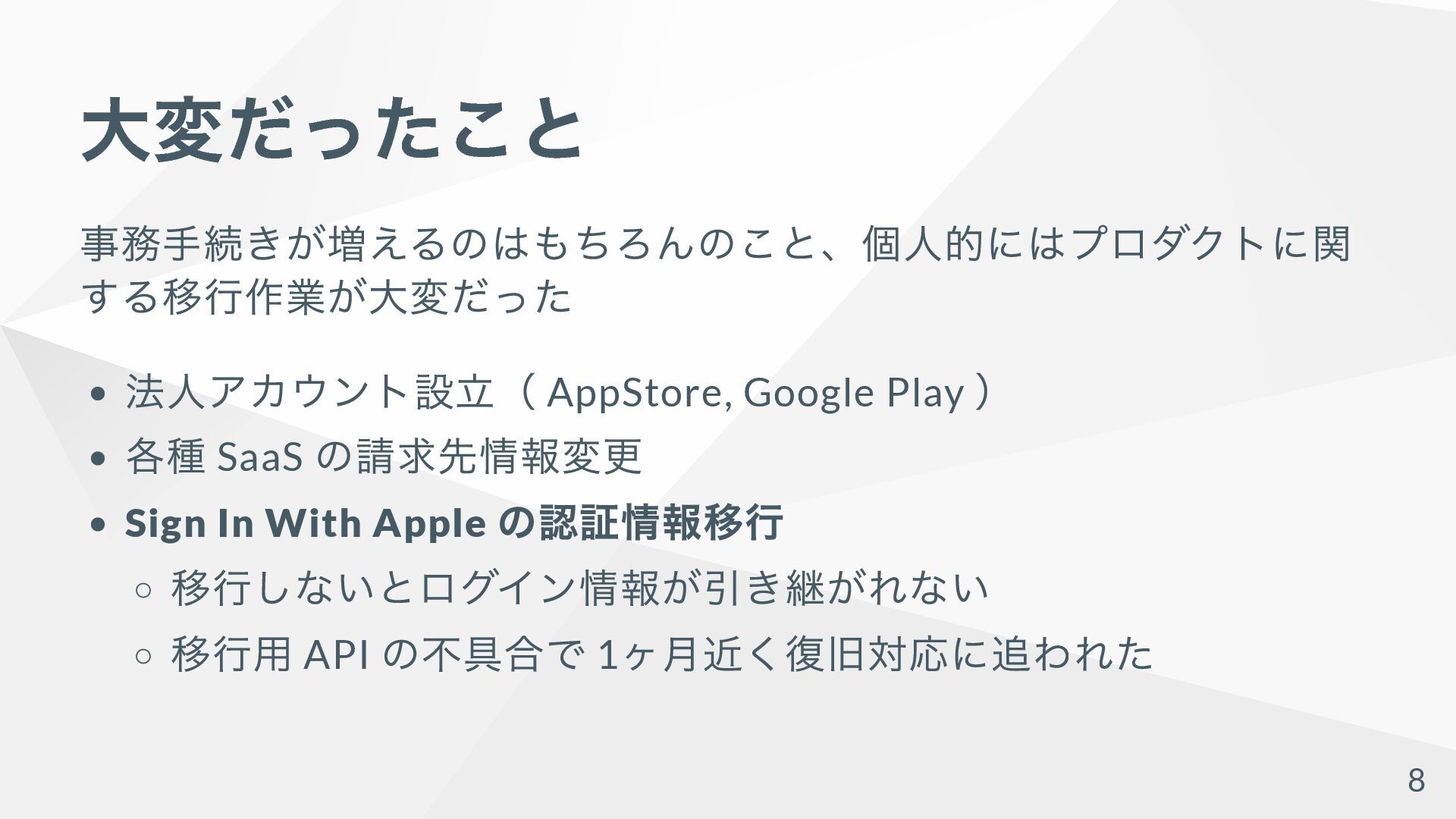 大変だったこと 事務手続きが増えるのはもちろんのこと、個人的にはプロダクトに関 する移行作業が大変だった 法人アカウント設立( AppStore, Google Play ) 各種 SaaS